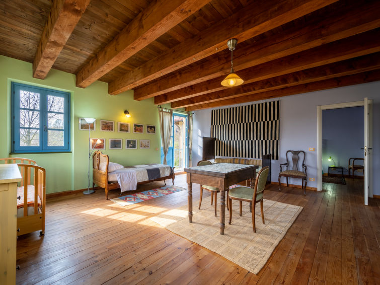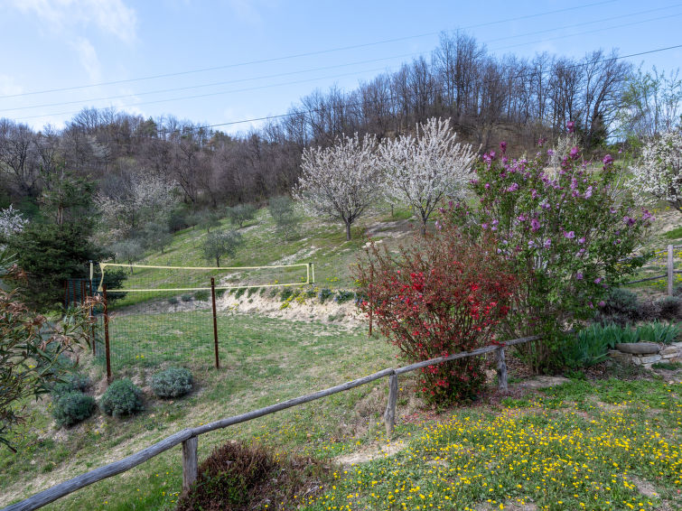 Cosy, rustic cottage "La Rovere", 450 m a.s.l., surrounded by trees, meadows and vineyards. 2 km from the centre of Cossano Belbo, 4 km from the centre of Stefano Belbo, 20 km from the centre of Alba, in a secluded, elevated position on a slope, 80 km from the sea. Private: property 5'000 m2, terraced garden with trees, meadow, swimming pool (9 x 4 m, depth 70 - 120 cm, seasonal availability: 01.May. - 15.Oct.). Table tennis, volleyball court, garden furniture, barbecue, pool maintenance by the owner/gardener. 500 m long motor access to the house (via unmade road). Parking at the house on the premises. Shop 2 km, supermarket 4 km, bus stop 4.1 km, railway station "Alba" 20 km. The owner does not accept any youth groups.10-room house 400 m2 on 2 levels. Rustic and wooden furniture furnishings: living room. Exit to the garden. Living room with dining table and kitchen corner. Exit to the garden. 1 room with 1 double bed and shower/WC. Kitchen-/living room (oven, dishwasher, 5 gas rings, freezer, electric coffee machine) with dining table. Exit to the garden. Shower/WC. Upper floor: walk-through room with 1 double bed and bath/WC. 1 room with 2 beds. Walk-through room with 1 double bed. 1 room with 1 double bed and shower/WC. Exit to the balcony. Walk-through room with 4 beds. 1 room with 1 double bed and shower/WC. Gas heating. Wooden floors. Patio, patio. Terrace furniture. Panoramic view. Facilities: washing machine, children's high chair, baby cot. Internet (WiFi, free). Please note: non-smokers only. Maximum 1 pet/ dog allowed. IT004074B5N6NSAM2A