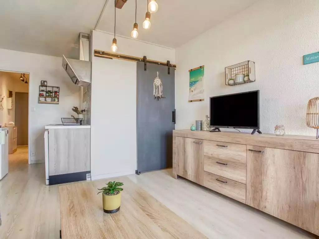 Seignosse Océan 6 km from Hossegor: The residence "La Sableyre" comprises of 250 apartments, in 4 buildins of 3 and 4 storeys residence "La sableyre". In the resort 200 m from the centre of Seignosse Océan, from the sea, 200 m from the beach. Public parking. Shopping centre 400 m, restaurant, café 200 m, bus stop "Office de tourisme" 500 m, sandy beach 200 m. Please note: no lift. The owner does not accept any youth groups.1-room apartment 30 m2 on 4th floor. Object suitable for 2 adults + 2 children. Practical and comfortable furnishings: living/dining room with 1 double sofabed (140 cm, length 190 cm), TV (flat screen). Exit to the balcony. 1 small room 4 m2 with sliding door with 1 x 2 bunk beds (90 cm, length 190 cm). Kitchenette (dishwasher, 2 ceramic glass hob hotplates, toaster, kettle, microwave, electric coffee machine). Shower, sep. WC. Electric heating. Terrace furniture. Facilities: washing machine, hair dryer. Garage at 800 m, height 190 cm, width 215 cm. Please note: suitable for families. Non-smokers only. Smoke alarm. 40296000968M6
