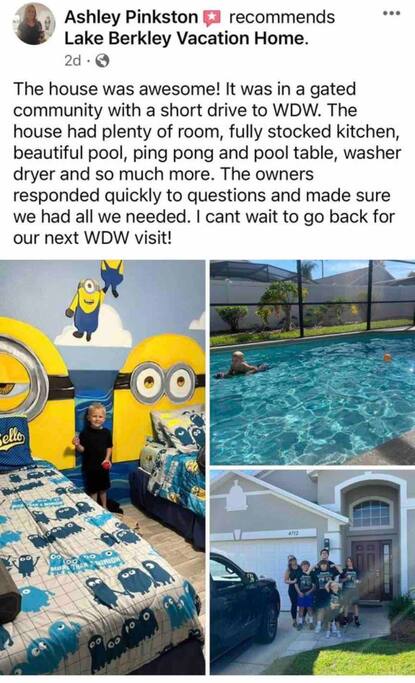 Our Updated 5 bedroom, 3 bathroom single story home has all the amenities you could ask for including a private secluded south facing pool. Theme parks, shopping and great dining options are just minutes away.Our home is equipped with a high chair, pack and play, stroller and a gas grill and high speed internet for your convenience. The resort offers main club house with pool/spa, gym, children's play area, tennis court, volley ball/badminton court, fishing on lake, with 24/7 security on gated exclusive community of Lake Berkley. Master suite with king size bed, ensuite shower and corner bathroom with walkin closet. Second bedroom with queen size bed and ensuite bathroom, third bedroom is a queen bed and two themed twin rooms and a family bathroom. Games Room Air conditioned as well!!