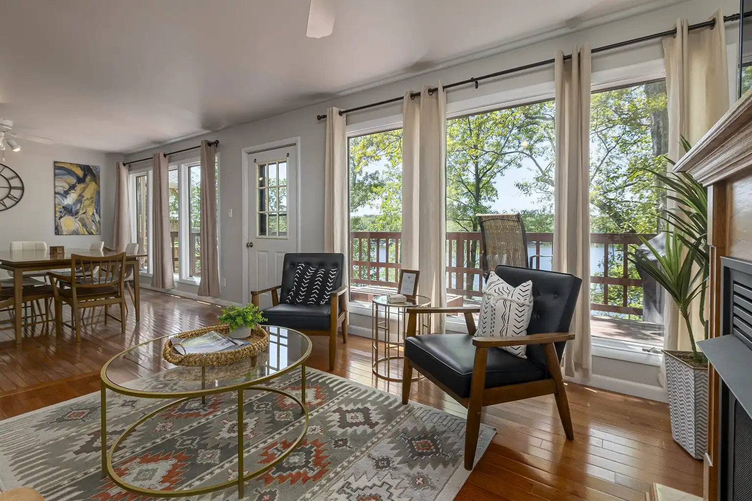 Patio walkout to the hot tub and soft seating conversation furniture.