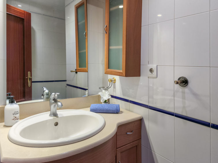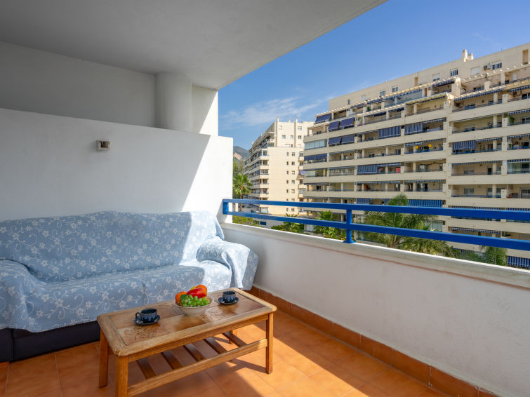 Urb. las Terrazas: Apartment block "Las Terrazas", 9 storeys, built in 2003. In the resort 700 m from the centre of Marbella, in a sunny position, 450 m from the sea. For shared use: large garden 3'000 m2 (fenced) lawn, swimming pool (seasonal availability: 15.Jun. - 15.Sep.). Children's pool. In the house: lift. Supermarket 5 m, restaurant 50 m, bus stop 80 m, sandy beach 450 m. Nearby attractions: Casco Historico Marbella 1.3 km, Plaza de Los Naranjos 1.4 km. The 3 swimming pools are laid out in the shape of a clover. The shared area is 30 m away. Please note: all services nearby.3-room apartment 80 m2 on 4th floor. Simple and practical furnishings: living/dining room 20 m2 with TV, air conditioning and forced-air heating. 1 room with 1 french bed and fan. 1 room with 2 beds (90 cm), fan. Kitchen (4 hot plates, oven, microwave, freezer). Bath/WC, sep. WC. Electric heating. Terrace 13 m2, east facing position and south facing position. Terrace furniture. View of the sea, the swimming pool and the garden. Facilities: washing machine, baby cot. Internet (WiFi, free). Garage space n -3 Nº10. VUT/MA/12585 // Reg. Nr.: ESFCTU0000290290007850020000000000000000VUT/MA/125852