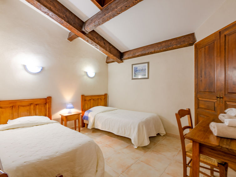 Large, rustic large working farm "Domaine de Majastre", surrounded by trees, meadows and fields. 14 apartments in the residence. Property composed of main house and outbuilding 8 km from the centre of Bauduen, 8 km from the centre of Aups, 8 km from the lake. For shared use: natural state property 60 ha with plants and trees, meadow, pond, swimming pool (15 x 7 m, seasonal availability: 01.May. - 15.Oct.). Poolhouse, boccia, terrace, garden furniture. In the complex: breakfast room, WiFi, washing machine (for shared use). Bread roll service on request. Parking on the premises. Shop 8 km, bus stop 8.5 km. On the estate animal husbandry. Please note: the owner lives on the same property. The owner has a dog. Additional accommodations can be booked."Laurier", 3-room apartment 75 m2 on 1st floor. Rustic and cosy furnishings: living/sleeping room with 1 double sofabed (140 cm, length 190 cm), dining table and satellite TV. Exit to the terrace. 1 room with sloping ceilings with rooflight with 2 beds (90 cm, length 190 cm). 1 room with sloping ceilings with rooflight with 1 french bed (140 cm, length 190 cm). Kitchenette (4 hot plates, oven, dishwasher, kettle, microwave, freezer, electric coffee machine). Bathroom, sep. WC. Oil heating. Terrace 25 m2, west facing position. Terrace furniture. Beautiful view of the countryside. Facilities: iron. Internet (WiFi, free). Maximum 2 pets/ dogs allowed. Offer by a commercial proprietor according to Art. 155, IV, CGI