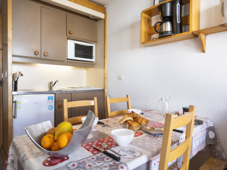 Residence "Les Lauzières". Below Val Thorens, in a central position, 50 m from the skiing area. In the house: lift. In Winter: please take snow chains. Public car park at 200 m, extra. Shop, grocery 100 m, supermarket 50 m, shopping centre 100 m, restaurant 50 m, bakery 100 m, café 50 m, pedestrian zone 100 m, 2 minute walk to the centre, bus stop 200 m. Skisport facilities 300 m, slopes 100 m, ski rental 50 m, ski bus stop 100 m, ski school 200 m, ice rink 500 m. Well-known ski regions can easily be reached: Le Domaine des 3 vallées 300 m. Well-known lakes can easily be reached: Lac du Lou 800 m. Please note: entertainment in the season. The owner does not accept any groups. Ski bus (free of charge). In case of good snow conditions, the house is accessible on skis. Additional accommodations can be booked."Lauzières 308", 2-room apartment 26 m2 on 3rd floor, south facing position. Living/dining room with 1 pull-out bed (2 x 80 cm, length 190 cm), TV (flat screen), electric heating. 1 small room 5 m2 with sliding door with 1 pull-out bed (2 pers. 2 x 80 cm, length 190 cm). Sleeping alcove with 1 x 2 bunk beds (80 cm, length 190 cm). Kitchenette (4 hot plates, oven, kettle, electric coffee machine). Bathroom, sep. WC. Balcony, south facing position. Facilities: Internet (WiFi, extra). Please note: maximum 1 pet/ dog allowed. Smoke alarm. Instead of an enclosed bedroom, some sleeping areas are located in an open-plan area (gallery, alcove, etc.). 73257010268HT