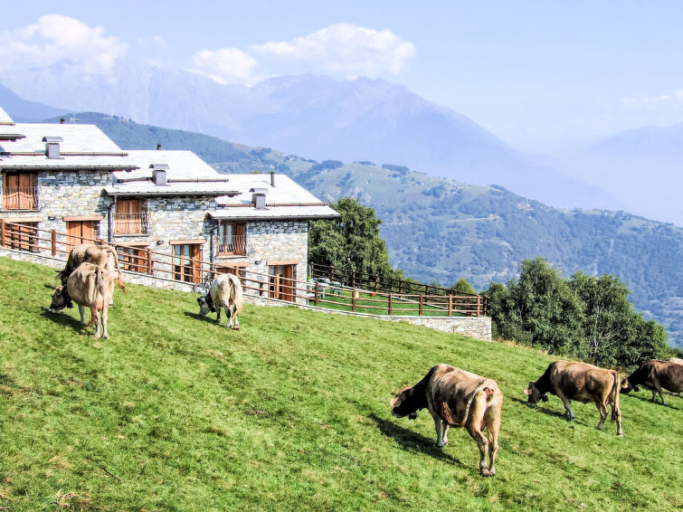 Rustic terraced house "Le Baite di Bodone", 1'150 m a.s.l., built in 2009. 4 houses in the residence. In the hamlet Bodone 12 km from the centre of Gravedona, 60 km from the centre of Como, 64 km from the centre of Lugano, in an elevated position on a slope, 12 km from the lake, in a cul-de-sac, in the countryside. Private: property 20 m2 (fenced), garden with lawn. Patio, garden furniture. Heating available only from 15.Oct. - 30.Apr.. 6 km long narrow motor access (100 m via unmade road, mountain road). Stepped path to the house. Parking on the premises, public parking 150 m. Shop 6 km, supermarket 13 km, bus stop 5.6 km, railway station "Como" 60 km, pebble beach "Lido di Gravedona" 12 km, outdoor swimming pool 12 km. Marina 12 km, golf course (18 hole) 39 km. Nearby attractions: Chiesa Santa Maria del Tiglio-Gravedona, Palazzo Gallio-Gravedona, Museo della Barca Lariana-Pianello, Menaggio, Bellagio, Villa Carlotta-Tremezzo. Well-known ski regions can easily be reached: Madesimo, Livigno, Sankt Moritz, Santa Caterina. Well-known lakes can easily be reached: Lago di Mezzola. Hiking paths: Sasso Pelo, Livo-Crotto Dangri."GRV610", 3-room terraced house 60 m2 on 2 levels, south facing position. Cosy and wooden furniture furnishings: living/sleeping room with 1 double sofabed, dining table and satellite TV. Exit to the garden. Kitchenette (oven, dishwasher, 4 gas rings, toaster, electric coffee machine). Shower/WC. Upper floor: 1 room with 1 french bed (160 cm). 1 room with 2 beds and 1 pull-out bed. Gas heating. Wooden floors. Garden. Terrace furniture, deck chairs (3). Marvellous panoramic view of the lake. Facilities: children's high chair, baby cot for up to 2 year olds. Internet (WiFi, free). Please note: non-smokers only. Private entrance, smoke alarm, fire extinguisher. Bed layout is flexible. There are more sleeping options available than the maximum number of people allowed which may, however, not be exceeded. IT013178C2B58NSQIU