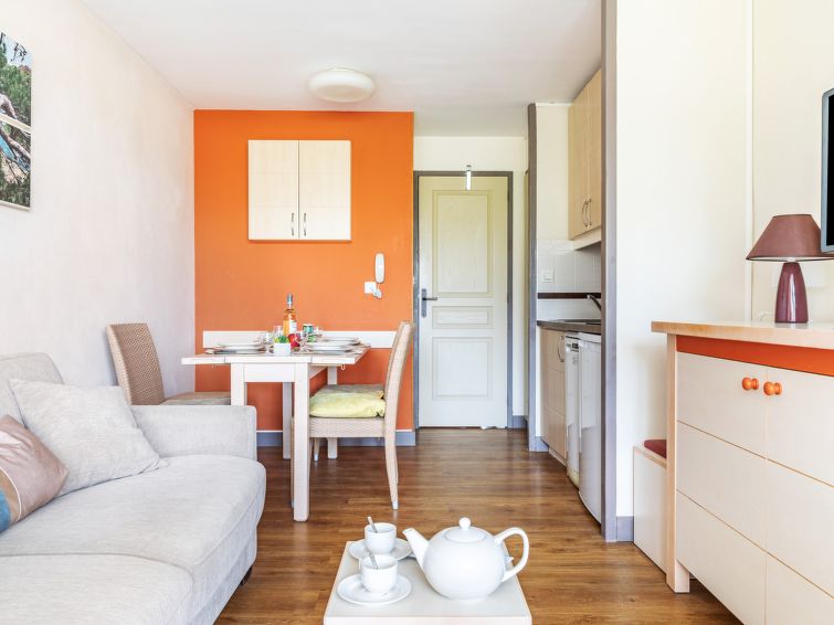 Large resort "Village Cap Estérel - Le Belvédère". On the outskirts, 2 km from the centre of Agay, on a slope, in the residential district, 400 m from the sea, 350 m from the beach, road to cross, on the golf course, in a pedestrian area. For shared use: park 210 ha, 5 swimming pools (seasonal availability: 06.Apr. - 03.Nov.). Children's pool, boccia, children's playground (slide, swing). In the complex: spa area (extra), shopping facilities, laundry (extra). Shop, grocery 200 m, supermarket 6 km, restaurant 150 m, bakery 500 m, bus stop "Ligne 21" 300 m, railway station "Saint-Raphaël-Valescure TGV" 9 km, sandy beach "Tiki Plage" 900 m. Marina 1 km, golf course (9 hole), tennis 500 m. Nearby attractions: Anthéor 8 km, Saint-Raphaël 9 km, Fréjus 13 km, Cannes 33 km, Saint-Tropez 50 km, Nice 76 km. Well-known lakes can easily be reached: Lac Saint-Cassien. Hiking paths: Massif de l'Estérel. Please note: car-free holiday complex, no lift. Entertainment in the season. Suitable for families, childminding in the season (extra). Guarded residence. The keys‘ handover takes place by the agency Interhome in Cap Estérel. Additional accommodations can be booked. Access to the apartments is via steps, even on the ground floor."Le Belvédère (R4 125)", 1-room studio 24 m2 on 1st floor. Object suitable for 2 adults + 2 children. Living room with 1 double sofabed (1 x 140 cm, length 190 cm), TV (flat screen). Exit to the terrace. Sleeping alcove with 1 x 2 bunk beds (80 cm, length 190 cm). Kitchenette (4 hot plates, dishwasher, toaster, kettle, microwave, electric coffee machine). Bath/WC. Electric heating. Terrace 8 m2. Terrace furniture. View of golf course. Facilities: washing machine. Internet (WiFi, free). Parking (1 car). Please note: non-smokers only. Maximum 1 small pet/ dog allowed. Smoke alarm. Instead of an enclosed bedroom, some sleeping areas are located in an open-plan area (gallery, alcove, etc.). Offer by a private individual according to Art. 155, IV of CGI.
