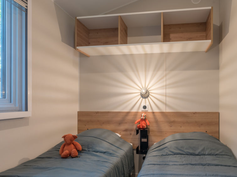 Child friendly resort "Le Mediterranée". 150 apartments in the residence. 3.3 km from the centre of Argelès-sur-Mer, 8 km from the centre of Saint Cyprien, 24 km from the centre of Perpignan, 2 km from the sea, 2 km from the beach. For shared use: property 55'000 m2, plants and trees, swimming pool (480 m2, depth 150 - 180 cm, seasonal availability: 24.Apr. - 20.Sep.) with internal staircase. Children's pool, slide, table tennis, boccia, terrace, children's playground. In the complex: reception, restaurant, bar, bistro, shopping facilities, washing machine, tumble dryer (for shared use, extra). Bread roll service. Parking. Shop 3.3 km, bus stop "Mairie/Hotel de ville-Argelès" 3 km, sandy beach 2 km. Golf course (9 hole) 15 km. Please note: car-free holiday complex. Entertainment. Childminding in the season. The owner does not accept any groups. Loading and unloading of baggage is possible at the holiday house. The photograph shows a typical example. The holiday properties may differ in living space, floorplan, equipment and furnishing."Le Mediterranée", 4-room mobile home 32 m2. Comfortable furnishings: living/dining room with dining table and TV (flat screen). Exit to the terrace. 1 room with 1 french bed (140 cm, length 190 cm). 2 rooms, each room with 2 beds (80 cm, length 190 cm). Open kitchen (4 gas rings, microwave, freezer, electric coffee machine). Shower, sep. WC. Air-conditioning, forced-air heating. Terrace partly roofed. Terrace furniture, deck chairs (2). Facilities: children's high chair, baby cot for up to 2 year olds (extra). Internet (WiFi, extra). Please note: maximum 1 pet/ dog allowed. Smoke alarm.