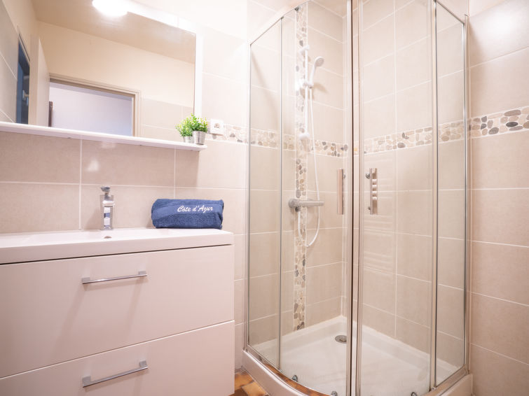 Residence "Les Louvans". In the resort 200 m from the centre of Saint Aygulf, excellent location: right in the centre but still quiet, 30 m from the sea, 30 m from the beach, direct access to the beach. For shared use: garden 1 ha (fenced) with plants and flowers, parking on the premises. Shop 200 m, shopping centre 4.5 km, 2 minute walk to the centre, bus stop "Saint-Aygulf La Poste" 350 m, railway station "Fréjus" 5 km, sandy beach "La Galiotte" 1 km, shingle beach "Calanque des Louvans" 30 m, park "ARECA" 800 m, diving center 6 km, thermal baths "Thalasso de Port Fréjus" 6 km. Sports harbour 1 km, golf course (18 hole) 8 km, sailing school 7 km, riding stable 3 km. Nearby attractions: Aqualand, Lunapark 5 km, Fréjus 6 km, St Raphael 8 km, St Tropez 29 km, Cannes 47 km, Nice 71 km. Well-known ski regions can easily be reached: Auron, Isola 2000 150 km. Well-known lakes can easily be reached: Lac de St Cassien 45 km, Lac du Du Verdon 90 km. Hiking paths: Estérel 16 km, Sentier du Littoral 30 m. Please note: no lift. Residence with electric gates.1-room studio 28 m2, on the ground floor, east facing position. Beautiful furnishings: living room with panoramic window with 1 double sofabed (160 cm, length 190 cm), TV and fan. Exit to the terrace. Kitchenette (oven, 2 ceramic glass hob hotplates, toaster, kettle, microwave, freezer, electric coffee machine). Shower/WC. Heating. Terrace 18 m2, east facing position. Terrace furniture, deck chairs (2). View of the sea. Facilities: iron. Internet (WiFi, extra). Parking space n B14. Please note: TV only FR. Smoke alarm. FJS830HT