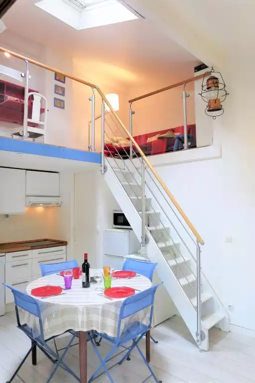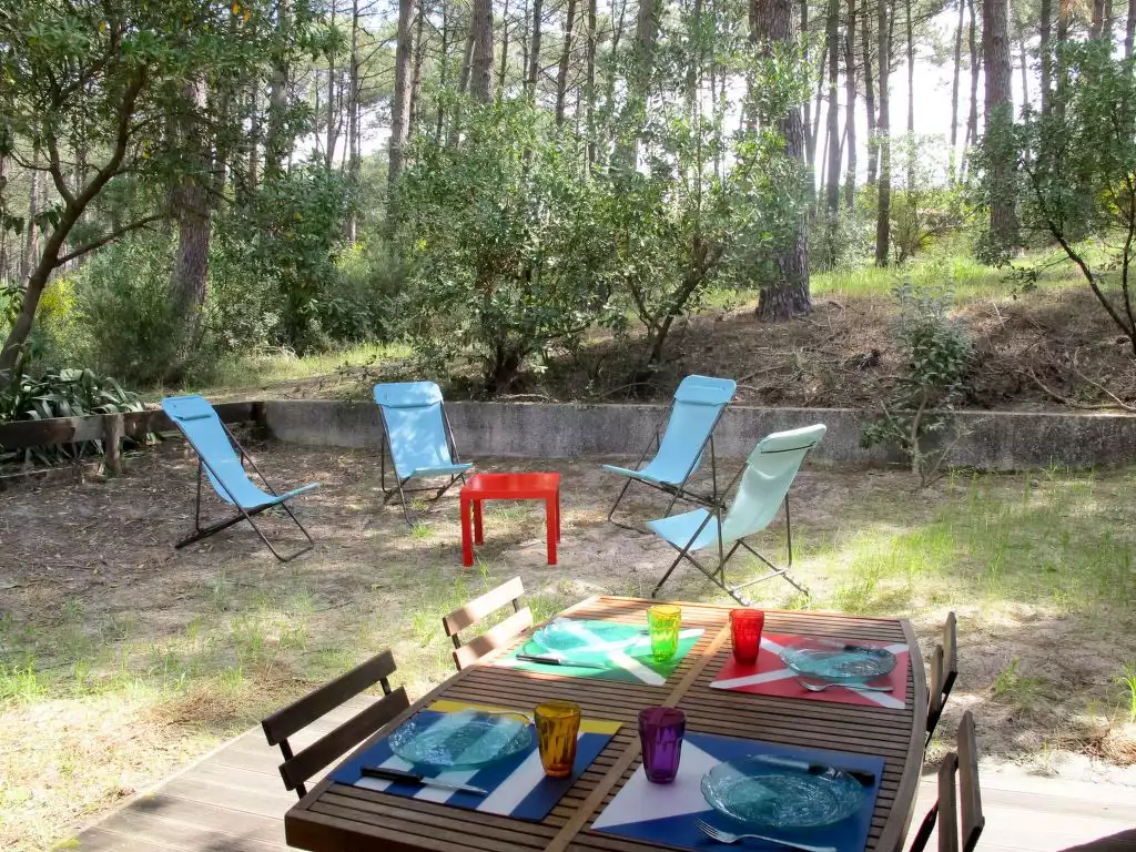 Terraced house "Les maisons de la forêt", surrounded by trees. 1.5 km from the centre of Lacanau-Océan, 10 km from the centre of Lacanau-Ville, 57 km from the centre of Bordeaux, 1.5 km from the sea, 4 km from the lake. Private: property 100 m2 with trees, parking at the house at 100 m. Supermarket 1.5 km, bus stop "Marie Curie" 900 m, sandy beach "Lacanau-Océan" 1.5 km, bathing lake "Lac de Lacanau, Le Moutchic" 4 km. Golf course (18 hole) 1.5 km.3-room terraced house 50 m2 on 2 levels. Object suitable for 4 adults + 1 child. Cosy furnishings: living/sleeping room with 1 sofabed (80 cm), dining table, satellite TV, radio and CD-player. Exit to the terrace. 1 room with 1 french bed (160 cm). Open kitchen (mini-oven, dishwasher, 4 ceramic glass hob hotplates, toaster, kettle, microwave, freezer, electric coffee machine). Shower/WC. Upper floor: open gallery with sloping ceilings with 1 sofabed (120 cm). 1 room with sloping ceilings with 1 french bed (140 cm). Electric heating. Wooden floors. Terrace partly roofed. Terrace furniture, electric barbecue, deck chairs (4), box-room. Facilities: washing machine, iron, children's high chair, baby cot (extra). Internet (WiFi, free). Please note: non-smokers only. Maximum 1 pet/ dog allowed. Smoke alarm. Bed layout is flexible. There are more sleeping options available than the maximum number of people allowed which may, however, not be exceeded. Instead of an enclosed bedroom, some sleeping areas are located in an open-plan area (gallery, alcove, etc.).