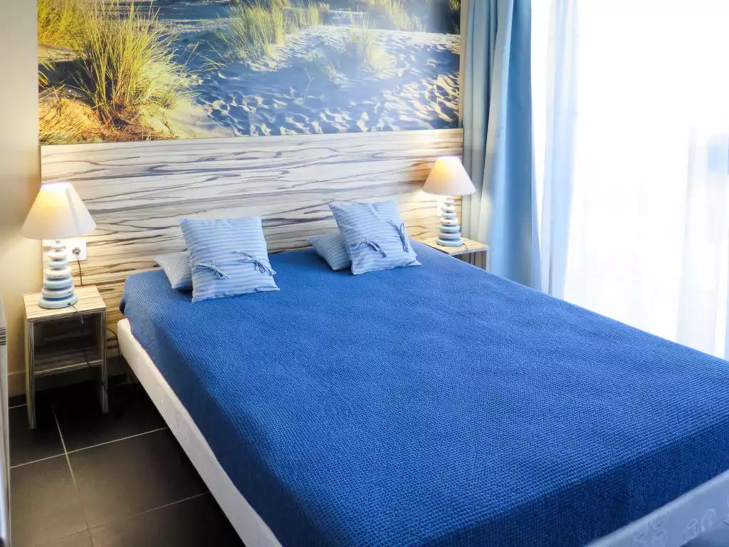 Residence "Les Sables d’Or", 3 storeys, built in 2016. 51 apartments in the residence. 900 m from the centre of Vieux-Boucau, 8.5 km from the centre of Soustons, 20 km from the centre of Capbreton, in a central position, 350 m from the sea. For shared use: swimming pool (16 m2, seasonal availability: 01.Apr. - 15.Sep.). Unconventional pool shape. Outdoor shower, hot tub. In the complex: fitness room, lift. Breakfast possible (extra). Communal covered parking, public parking on the road. Shop 50 m, supermarket 2 km, bus stop "Eglise (3)" 1.5 km, sandy beach 350 m, bathing lake "Lac Marin de Port d'Albret" 1 km. Golf course (18 hole) 9 km, tennis 750 m. The owner does not accept any youth groups. Please note: the photograph shows a typical example. The holiday properties may differ in living space, floorplan, equipment and furnishing."Les Sables d’Or T2 Cab", 2-room apartment 43 m2, on the ground floor. Object suitable for 2 adults + 2 children. Modern and cosy furnishings: living/sleeping room with 1 double sofabed, dining table, TV and CD-player. Exit to the terrace. 1 room with 1 french bed (160 cm). Exit to the terrace. 1 open room with 1 x 2 bunk beds (80 cm). Open kitchen (oven, dishwasher, 4 ceramic glass hob hotplates, toaster, kettle, microwave, freezer, electric coffee machine, Capsules for coffee machine (Dolce Gusto) extra). Shower/WC. Electric heating. Terrace. Terrace furniture, deck chairs (2). Facilities: washing machine, iron, children's high chair, baby cot (extra), hair dryer. Internet (WiFi, free). Please note: smoke alarm.