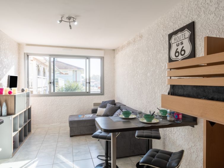 Mimizan Plage: Residence "Les vagues". In the resort 50 m from the centre of Mimizan plage, in a central, busy position, 150 m from the sea, 150 m from the beach, 150 m from the river, in a pedestrian area. Shop 150 m, supermarket 300 m, restaurant, bar, bakery, pedestrian zone 20 m, bicycle rental 50 m, bus stop 200 m, railway station "Labouheyre" 30 km, sandy beach "la garluche" 150 m, bathing lake "Aureilhan" 10 km. Golf course (9 hole) 6 km, surf school 150 m. Nearby attractions: Bordeaux 120 km, Arcachon 70 km, Biscarrosse 40 km, Centre nautique 7 km, casino Mimizan Plage 1 km. Hiking paths: Eco musée de Marquèze 40 km.1-room apartment 18 m2 on 1st floor. Practical furnishings: living/dining room with 1 sofabed (130 cm, length 190 cm), 1 x 2 bunk beds (90 cm, length 190 cm), dining nook and TV (flat screen), electric heating and electric heater. Open kitchen (1 induction hot plates, 2 gas rings, toaster, kettle, microwave, electric coffee machine, Capsules for coffee machine (Nescafe Dolce Gusto) extra). Shower/WC. Facilities: washing machine, iron, hair dryer. Internet (WiFi, extra). Please note: apartment street side. Maximum 1 pet/ dog allowed. Smoke alarm.