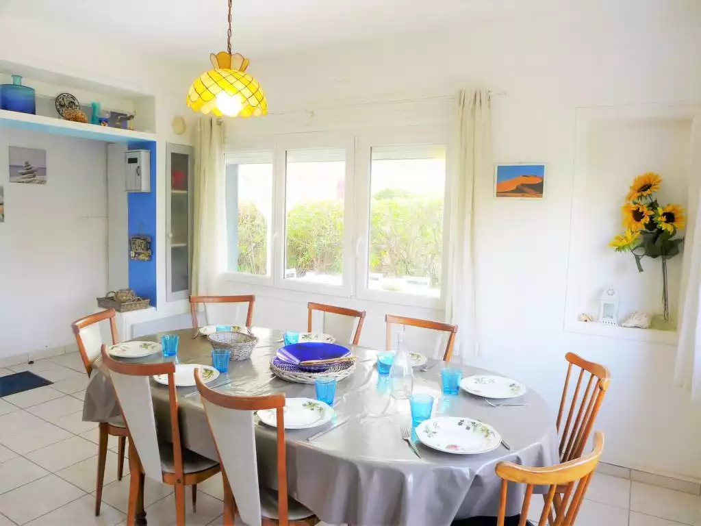 Single-family house "Les Vives", 2 storeys, built in 1953. 800 m from the centre of Narbonne-Plage, 150 m from the sea, 100 m from the beach. Private: garden (fenced). Outdoor shower. Shop 800 m, grocery, restaurant, bar 400 m, bus stop 300 m, diving center 900 m. Sports harbour 900 m, riding stable 5 km. Nearby attractions: Réserve Africaine de Sigean 33 km, Cité de Carcassonne 73 km, Espace balnéoludique de Gruissan 7 km.5-room house 100 m2 on 2 levels. Living/dining room with TV (flat screen). 1 room with 1 french bed (140 cm). 1 room with 2 beds (80 cm). Open kitchen (4 hot plates, oven, dishwasher, toaster, kettle, microwave, freezer). Shower/WC. Upper floor: 1 large room with 1 french bed (140 cm), 1 pull-out bed (2 pers.). 1 room with 2 beds. Shower/WC. Electric heating. Terrace roofed, south-east facing position, large garden. Terrace furniture, barbecue. Facilities: washing machine, iron, children's high chair. Internet (WiFi, free). Parking (fenced). Please note: smoke alarm. Please note: sea view from the 2 bedroom upstairs. Offer by a private individual according to Art. 155, IV of CGI. FR1I156