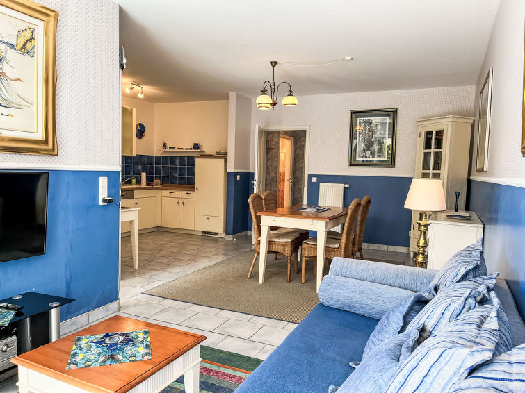 Apartment block. In the resort 850 m from the centre of Koserow, 750 m from the sea, from the beach. In the house: storage room for bicycles, central heating system. Parking on the premises. Supermarket 900 m, restaurant 300 m, bakery 1 km, café 1.3 km, bus stop 950 m, railway station 1.4 km, sandy beach 750 m, thermal baths "Bernsteintherme" 9 km. Golf course (18 hole) 18 km, surf school 9 km, minigolf 850 m."Lia", 2-room apartment 60 m2, on the ground floor. Bright, cosy furnishings: living/dining room with 1 sofabed and cable TV (flat screen), radio. Exit to the terrace. 1 room with 1 double bed. Exit to the terrace. Kitchenette (oven, dishwasher, 4 ceramic glass hob hotplates, toaster, kettle, microwave, electric coffee machine). Shower/WC. Terrace. Terrace furniture. Facilities: children's high chair, baby cot, hair dryer. Internet (WiFi, free). Please note: not suitable for small children. Non-smokers only. Maximum 1 pet/ dog allowed. Smoke alarm.