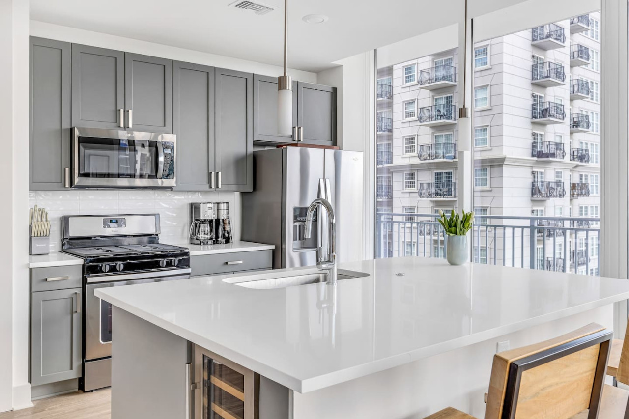 Put skip in your step staying in this light-filled home just a stone’s throw from Piedmont Park! Towering windows frame a stunning city view when wanted, then pop the roller shades down when ready to hunker down/recharge. Be charmed by the southern hospitality and luxe amenities of this amazing high-rise community. Huge kitchen island perfect for working. Wine fridge, comfy king bed, super fast WiFi, rooftop gym/pool, and more. Gated garage parking, washer/dryer, housewares, utilities included.
