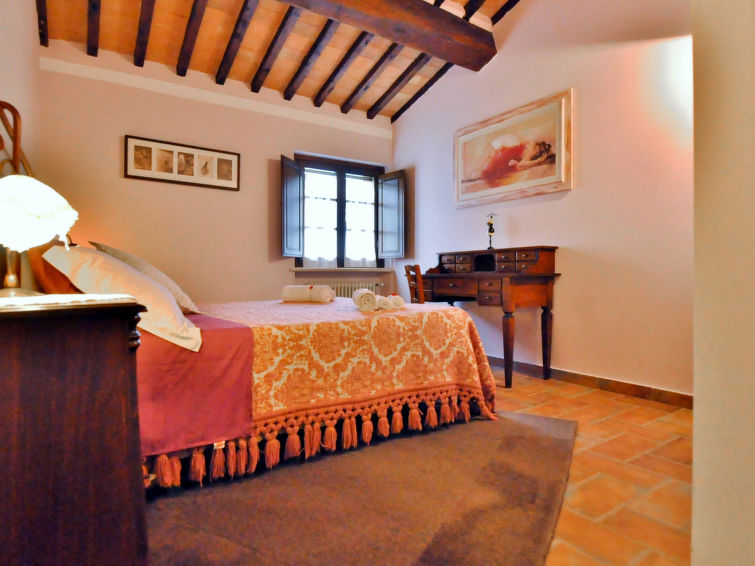 Very beautiful country house "Linearis", detached, surrounded by trees, fields and vineyards. 9 apartments in the residence. In the district of Linari 3 km from the centre of Poggibonsi, 6 km from the centre of Barberino Val d'Elsa, 15 km from the centre of San Gimignano, in a secluded, sunny, elevated position, 82 km from the sea, in the countryside. For shared use: beautiful, well-kept garden 10'000 m2 (fenced) with plants and trees, meadow, swimming pool fenced (14 x 7 m, depth 165 cm, seasonal availability: 01.Apr. - 05.Nov.). Outdoor shower, poolhouse with shower and WC, terrace, garden furniture, barbecue, children's playground, pool maintenance by the owner/gardener. In the complex: reception, lounge, washing machine (extra), tumble dryer (for shared use, extra). House maid on request (extra). 100 m footpath to the house. Parking on the premises, communal covered parking (extra). Grocery 2 km, supermarket 3 km, restaurant 2 km, bakery 2 km, bus stop 3 km, railway station "Poggibonsi" 3 km, sandy beach "Cecina Mare" 72 km, indoor swimming pool 3 km. Nearby attractions: Siena 36 km, Firenze 46 km, Volterra 38 km, Pisa 90 km. Please note: reception open 09:00-13:00 hrs. Suitable for families, baby equipment (included). Local sale of farm products. Please note: Loading and unloading of baggage is possible at the holiday house. Residence with electric gates. The owner lives in the same residence. All houses/apartments are individually designed/furnished. Obligation to wear bathing caps."Linearis B", 3-room apartment 60 m2 on 2 levels. Object suitable for 4 adults + 2 children. Bright, renovated, beautiful and tasteful furnishings: living/sleeping room with 1 double sofabed, dining table and satellite TV. Open kitchen (4 hot plates, mini-oven, electric coffee machine). Upper floor: 1 double bedroom. 1 room with 2 beds (80 cm). Shower/bidet/WC. Gas heating. Natural stone floors. Patio. Terrace furniture, barbecue, box-room. Very beautiful panoramic view of the countryside. Facilities: mosquito net, children's high chair, baby cot for up to 2 year olds, hair dryer. Internet (WiFi, free). Parking, garage (extra) on the property at the house. Please note: suitable for families. Non-smokers only. Maximum 1 pet/ dog allowed. Private entrance, fire extinguisher. No mandatory extra charges to be paid on-site except for local tax. Bedlinen, towels, final cleaning and all energy costs are included. IT048054B4SIWT4EGH