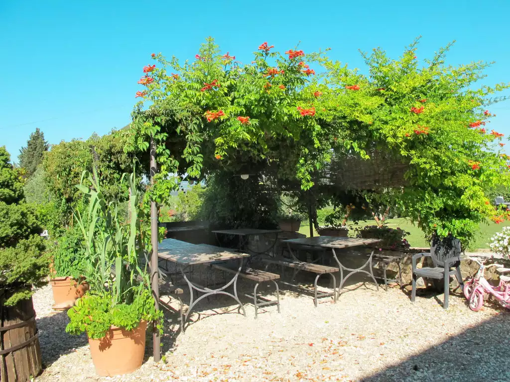 Very beautiful country house "Linearis", detached, surrounded by trees, fields and vineyards. 9 apartments in the residence. In the district of Linari 3 km from the centre of Poggibonsi, 6 km from the centre of Barberino Val d'Elsa, 15 km from the centre of San Gimignano, in a secluded, sunny, elevated position, 82 km from the sea, in the countryside. For shared use: beautiful, well-kept garden 10'000 m2 (fenced) with plants and trees, meadow, swimming pool fenced (14 x 7 m, depth 165 cm, seasonal availability: 01.Apr. - 05.Nov.). Outdoor shower, poolhouse with shower and WC, terrace, garden furniture, barbecue, children's playground, pool maintenance by the owner/gardener. In the complex: reception, lounge, washing machine (extra), tumble dryer (for shared use, extra). House maid on request (extra). 100 m footpath to the house. Parking on the premises, communal covered parking (extra). Grocery 2 km, supermarket 3 km, restaurant 2 km, bakery 2 km, bus stop 3 km, railway station "Poggibonsi" 3 km, sandy beach "Cecina Mare" 72 km, indoor swimming pool 3 km. Nearby attractions: Siena 36 km, Firenze 46 km, Volterra 38 km, Pisa 90 km. Please note: reception open 09:00-13:00 hrs. Suitable for families, baby equipment (included). Local sale of farm products. Please note: Loading and unloading of baggage is possible at the holiday house. Residence with electric gates. The owner lives in the same residence. All houses/apartments are individually designed/furnished. Obligation to wear bathing caps."Linearis J", 3-room semi-detached house 80 m2 on 2 levels, on the ground floor. Object suitable for 4 adults + 2 children. Spacious, renovated, beautiful and tasteful furnishings: living/sleeping room with 1 double sofabed, dining table and satellite TV. Exit to the garden. Kitchen (mini-oven, 4 gas rings, toaster, kettle, electric coffee machine). Exit to the garden. Shower/WC. Upper floor: 1 room with 1 french bed (160 cm). 1 room with 1 french bed (140 cm). Sep. WC. Gas heating. Natural stone floors. Patio. Terrace furniture, barbecue. Very beautiful panoramic view of the countryside. Facilities: mosquito net, children's high chair, baby cot for up to 2 year olds, hair dryer. Internet (WiFi, free). Parking (1 car), garage (extra) on the property at the house. Please note: suitable for families. Non-smokers only. Maximum 1 pet/ dog allowed. Private entrance, fire extinguisher. No mandatory extra charges to be paid on-site except for local tax. Bedlinen, towels, final cleaning and all energy costs are included. IT048054B5VT7E24DT