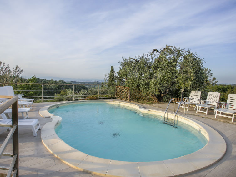 Cosy cottage "Lisena", 250 m a.s.l., 2 storeys, detached, surrounded by trees and vineyards. 9.5 km from the centre of San Miniato, 1 km from the centre of Balconevisi, 18 km from the centre of Montaione, in a secluded, sunny, elevated position, 60 km from the sea, in the countryside. Private: property 500 m2 (fenced), beautiful terraced garden with trees, swimming pool kidney shaped (7 x 5 m, depth 130 cm, seasonal availability: 01.May. - 30.Sep.). Outdoor shower, terrace, garden furniture, barbecue, pool maintenance by the owner/gardener. Parking on the premises. E-charging station. Shop 1 km, grocery 1 km, supermarket 13 km, restaurant 1 km, bar 1 km, railway station "S. Miniato Basso" 13 km, sandy beach "Marina di Pisa" 60 km. Golf course (9 hole) 13 km. Nearby attractions: San Gimignano 35 km, Volterra 45 km, Pisa 47 km, Firenze 52 km. Please note: car recommended. Baby equipment (included). Object suitable for 7 adults + 2 children groups of teenagers on request only. Part of the house is closed and unoccupied. Residence with electric gates."Lisena", 6-room house 125 m2 on 2 levels. Object suitable for 7 adults + 2 children. Renovated, rustic and cosy furnishings: 1 large double bedroom. Kitchen-/living room (oven, dishwasher, 4 gas rings, toaster, electric coffee machine) with open-hearth fireplace and dining table. Shower/bidet/WC. Upper floor: living/sleeping room with 1 double sofabed and satellite TV (flat screen). 1 double bedroom. 1 room with 2 beds. 1 room with 1 bed. Open kitchen (oven, dishwasher, 4 gas rings, toaster) with dining nook. Shower/bidet/WC. Gas heating (extra). Natural stone floors. Terrace roofed, patio. Terrace furniture, barbecue, deck chairs. Marvellous panoramic view of San Miniato. Facilities: washing machine, iron, children's high chair, baby cot for up to 2 year olds, hair dryer. Internet (WiFi, free). Parking (3 cars) at the house. E-charging station. Please note: suitable for families. Non-smokers only. No internal connecting door between the separated properties. No internal connecting door between the floors. The pool mentioned in the description is for private use. No mandatory extra charges to be paid on-site except for local tax. Bedlinen, towels, final cleaning and all energy costs are included. IT050032C2FQR78WKR