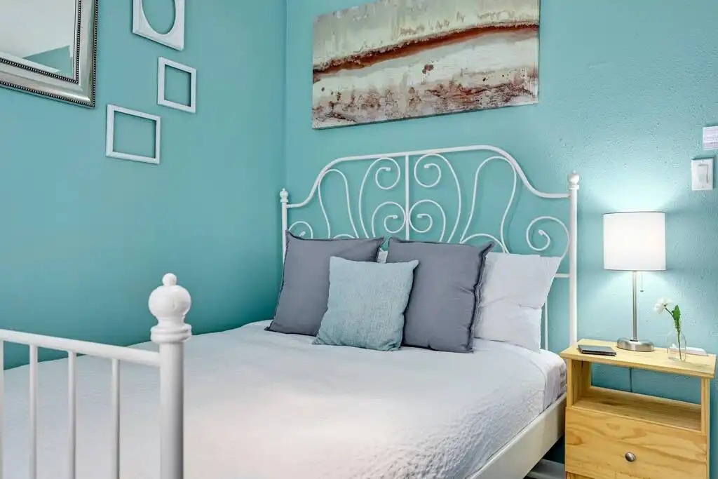 The Whimsical Room is the smallest room with a new queen size bed, desk, and lovely energy from the trees that live outside it.