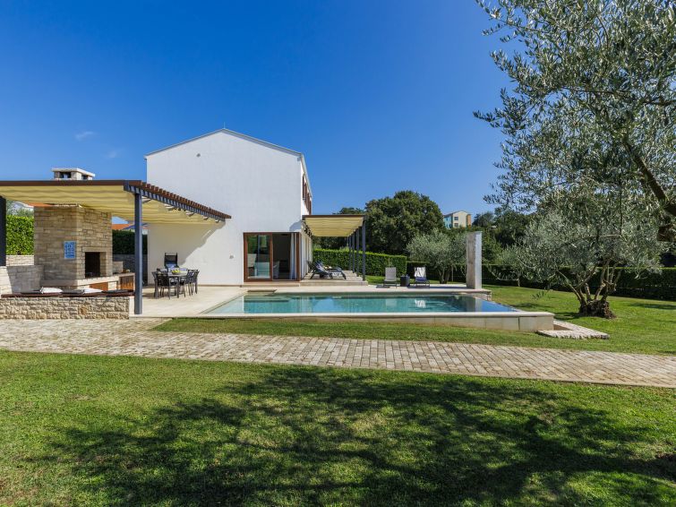 Modern villa "Luna Nera", 2 storeys. 6 km from the centre of Žminj, 13 km from the centre of Pazin, in a quiet, sunny position, 27 km from the sea. Private: property 1'000 m2, beautiful, well-kept garden with lawn and wildlife garden, swimming pool angular (10 x 5 m, depth 140 cm, seasonal availability: 01.Jan. - 31.Dec.) with internal staircase. Outdoor shower, pergola (30 m2), garden furniture, barbecue. In the house: internet access, washing machine, tumble dryer. Parking at the house on the premises. Shop 600 m, supermarket 6 km, restaurant 1 km, café 400 m, bus stop 6.6 km, railway station 500 m, pebble beach 27 km. Riding stable 7 km, walking paths from the house 1 km, cycle lane 1 km. Groups of teenagers on request only.4-room villa 154 m2 on 2 levels. Beautiful furnishings: living/dining room with satellite TV (flat screen), CD-player, DVD and air conditioning. Exit to the terrace, to the swimming pool. Open kitchen (oven, dishwasher, 4 induction hot plates, microwave, freezer, electric coffee machine). Sep. WC. Upper floor: 1 room with 1 french bed (180 cm, length 200 cm), bath/bidet/WC and air conditioning. 1 room with 2 beds (90 cm, length 200 cm), air conditioning. 1 room with 1 french bed (180 cm, length 200 cm), air conditioning. Bath/WC. Heating. Terrace 30 m2. Terrace furniture, deck chairs. View of the swimming pool and the garden. Facilities: safe, children's high chair, baby cot. Internet (WiFi, free). UP/I-335-02/16-01/25