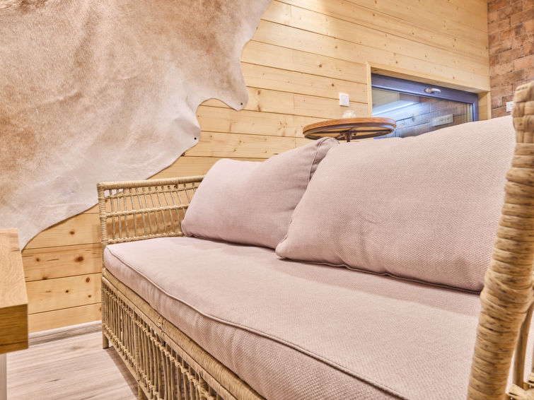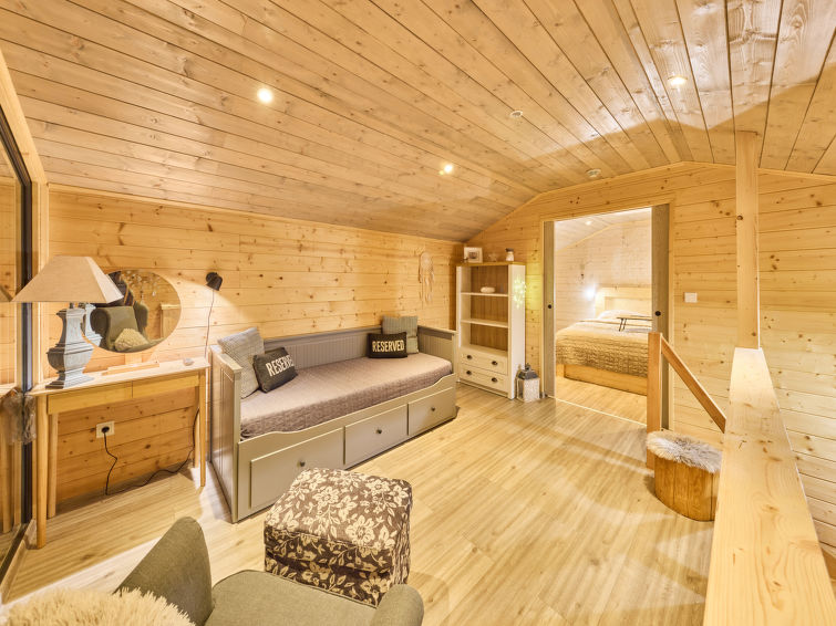 Very beautiful chalet "Luxe Timber Lodge & Yoga Loft", 2 storeys, detached, built in 2023. 7 houses in the resort. Outside the resort, in a quiet, sunny position, 5 m from the edge of the forest, 2 km from the skiing area. For shared use: natural state property, lawn for sunbathing, swimming pool (seasonal availability: 26.Jun. - 03.Sep.). Shower/WC in the pool area, table tennis, boccia, badminton, beach volleyball, barbecue, fireplace. Private: patio, fireplace. In the complex: WiFi, billiard table, storage room for bicycles, sun terrace, storage room for skis. Roofed, parking at the house. E-charging station. Grocery 1.5 km, shopping centre 6 km, restaurant 5.5 km, bus stop "Mladé Buky" 1.5 km, railway station "Mladé Buky" 1.5 km, indoor swimming pool 10 km. Golf course (18 hole) 4 km, riding stable 3.5 km, walking paths from the house, cycle lane 50 m, ski rental 2.5 km, ski bus stop 50 m, ski school 2.5 km, children's ski school 2.5 km, sled run 2 km, cross country ski track 500 m, children's playground 50 m. Nearby attractions: zábavní park Baldův svět, 2.5 km, Rozhledna Eliška, tvrz Stachelberg 9 km, Stezka Korunami stromů Janské Lázně 10 km, Lanovka na Sněžku, Pec pod Sněžkou 18 km, Zoo Dvůr Králové, Adršpach 28 km, Vyhlídkové lety Vrchlabí, Kuks 30 km. Well-known ski regions can easily be reached: Mladé Buky 2 km, Janské Lázně 9 km, Černý Důl, Pec-Černá hora 15 km. Hiking paths: Krkonošský národní park."Luxe Timber Lodge & Yoga Loft", 3-room chalet. Very beautiful and tasteful furnishings: living/dining room with Scandinavian wood stove, dining table and TV. Kitchenette (2 hot plates, oven, dishwasher, toaster, kettle, microwave, electric coffee machine, Capsules for coffee machine (Tchibo)). Shower/WC. Electric heating, wood heating, floor heating. Upper floor: 1 room with 1 double bed. Open living room with 1 double sofabed (140 cm), TV. Exit to the balcony. Balcony. Balcony furniture, barbecue. Facilities: Internet (WiFi, free). Please note: suitable for families. Non-smoking house. Built-in bluetooth audio system and central touch control of lighting and temperature conveniently from the living room. Instead of an enclosed bedroom, some sleeping areas are located in an open-plan area (gallery, alcove, etc.).