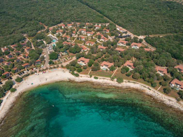 Child friendly resort "Mon Perin". 6 km from the centre of Bale, 17 km from the centre of Rovinj, in a quiet, sunny position, at the seaside, on the beach. For shared use: property with trees, swimming pool (400 m2, depth 45 - 135 cm, seasonal availability: 18.May. - 21.Sep.). Children's pool, tennis, basketball, boccia, beach volleyball, children's playground, pool maintenance by the owner/gardener. Private: property 150 m2 with wildlife garden. Hot tub. In the complex: restaurant, bar, internet access, sauna (extra). Hot tub, infrared sauna, relaxation room, spa area for shared use hamam, table football, shopping facilities, air conditioning, laundry (for shared use, extra), bicycle rental. Parking at the house on the premises. E-charging station. Bus stop 4.2 km, pebble beach "Mon Perin", rocky beach "Mon Perin". Riding stable 500 m, walking paths from the house 100 m, cycle lane 150 m. Please note: entertainment. The camp has 1 additional paddling pool (90 m2, depth 60 cm, open from 01.06.-03.10.). Wellness and spa with indoor pool is for use only by adults over 18 years old."Luxury Bay Villa with private hot tub", 3-room villa 67 m2. Beautiful and modern furnishings: living/dining room with 1 sofabed (88 cm, length 260 cm), satellite TV. Exit to the terrace. 1 room with 1 french bed (200 cm, length 220 cm), shower/WC. 1 room with 2 beds (100 cm, length 220 cm), shower/WC. Open kitchen (oven, dishwasher, 4 ceramic glass hob hotplates, toaster, kettle, microwave, electric coffee machine). Heating. 2 terraces 20 m2, covered terrace 35 m2. Terrace furniture, barbecue (portable), deck chairs (4). Facilities: washing machine, safe, iron, hair dryer. Internet (WiFi, free). Please note: suitable for families. Non-smoking house. The property is one of a type of property or apartment. The mobil homes are situated 70 - 150 m from the sea and the beach.