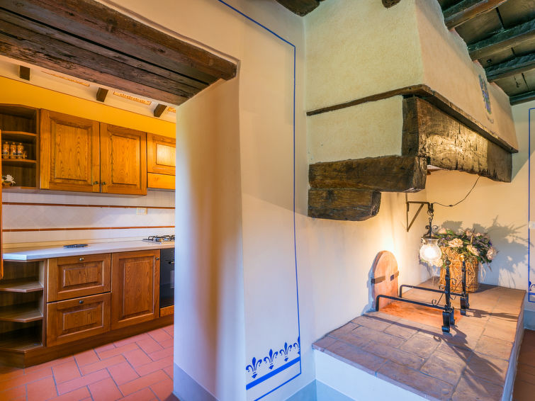 Borgo Stoppi, situated at 600 m a.s.l. at the foot of the Castello Poggio alla Regina, was a property of the counts Guidi since the 11th Century and after some changes of owners, in the 14th Century it became the main centre of the medieval district named "Curia del Castiglione" and agricultural capital of the surrounding mountain area, with its own town hall and big weekly market. Today, the old houses of the hamlet have been restored to 8 units, enhancing in a superb manner the beauty this affascinating place has maintained during the centuries: cypress, oak, pine and chestnuts trees are silent testimonies of Nature and wild boars, hares, squirrels, phaesants and owls may be watched in the surroundings. From the terrace covered with olive trees that produce one of the best and genuine olive oils of the area, you can enjoy a magnificent panorama over the Arno valley and the Chianti hills. Residence "Borgo Stoppi", 600 m a.s.l.. 2.5 km from the centre of Reggello, 30 km from the centre of Firenze, 35 km from the centre of Arezzo, in a quiet, sunny, elevated position, 70 km from the lake, in a cul-de-sac, in the countryside. For shared use: property 5'000 m2, swimming pool (6 x 12 m, depth 150 cm, seasonal availability: 22.May. - 08.Oct. pool opening hours: 08:00-21:00). Outdoor shower. Heating to be paid on the spot, heating available only from 01.Nov. - 07.Apr.. Steep motor access to the house (800 m via unmade road). Parking on the premises. Shop 2.5 km, grocery 2.5 km, supermarket 2.5 km, restaurant 2.5 km, bar 2.5 km, café 2.5 km, bus stop 3.5 km, railway station "Figline Valdarno" 10 km, bathing lake "Lago di Bilancino" 70 km. Nearby attractions: Firenze 40 km, Siena 86 km, Arezzo 64 km, Abazzia di Vallombrosa 16 km. Please note: car recommended. Suitable for families. The photograph shows a typical example."Madonna", 5-room apartment 104 m2, on the ground floor. Rustic and stylish furnishings: living room with 1 sofabed and satellite TV. Dining room. 1 double bedroom with shower/bidet/WC. 1 double bedroom with 2 beds and separate WC. 1 room with 2 beds. Kitchenette (4 hot plates, oven, dishwasher, freezer). Shower/bidet/WC. Gas heating. Garden 150 m2. Terrace furniture, barbecue. Beautiful view of the countryside. Parking. Please note: non-smokers only. Attention: The room with divan bed is the entrace hall. IT048035C2PEITCSC7