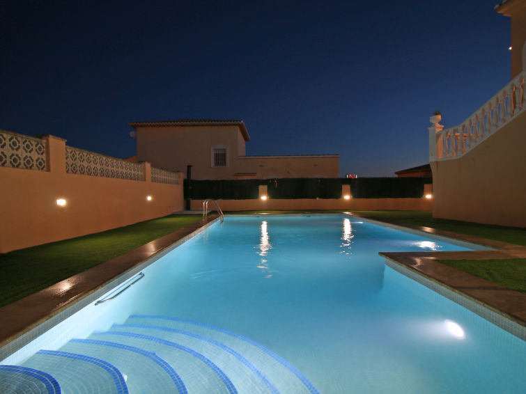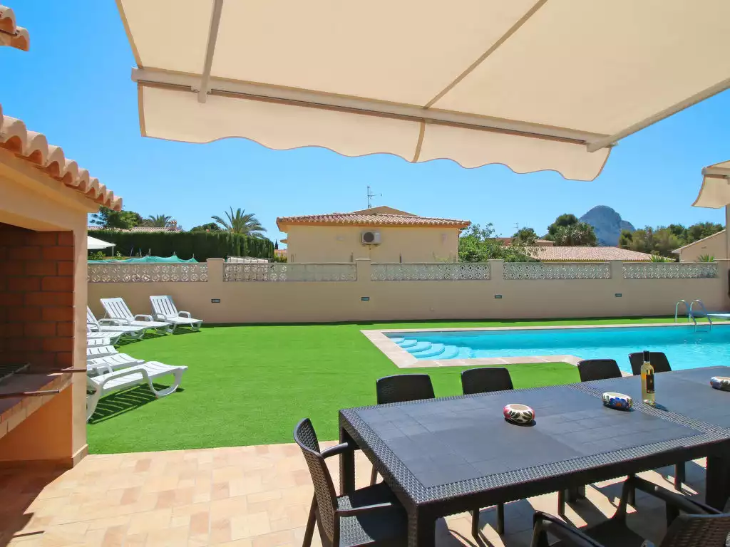 Marisol Park: House "Magia", built in 2018. In the district of Marisol Park 2 km from the centre of Calpe, 67 km from the centre of Alicante, 122 km from the centre of Valencia, in a sunny position in the residential district, residential area (villas), 2 km from the sea. Private: property 900 m2 (fenced), swimming pool angular (11 x 5 m, seasonal availability: 01.Jan. - 31.Dec.) with internal staircase. WC in the pool area, outdoor shower, barbecue, barbecue house. In the house: air conditioning. Parking (for 5 cars) on the premises. Supermarket 1 km, bus stop 1.3 km, sandy beach "Playa El Arenal" 2 km. Nearby attractions: Parque atracciones Terra Mítica 35 km, Parque Acuático Aqualandia 25 km. Hiking paths: Parque natural Peñon de Ifach 2.7 km."Magia", 9-room villa 318 m2 on 2 levels. Object suitable for 16 adults. Beautiful and tasteful furnishings: living/sleeping room with 1 folding bed, satellite TV and digital TV. Exit to the terrace, to the swimming pool. 1 room with 2 beds (90 cm, length 190 cm), air conditioning and forced-air heating. 1 room with 1 french bed (150 cm, length 190 cm), electric heating, air conditioning and forced-air heating. 1 room with 1 french bed (150 cm, length 190 cm), shower/WC, air conditioning and forced-air heating. Dining room with dining table, satellite TV and digital TV. Exit to the terrace, to the swimming pool. Open kitchen (oven, dishwasher, 4 ceramic glass hob hotplates, toaster, kettle, microwave, freezer, electric coffee machine). Shower/WC, sep. WC. Upper floor: 1 room with 2 beds (90 cm, length 190 cm), air conditioning and forced-air heating. Exit to the terrace. 1 room with 2 beds (90 cm, length 190 cm), electric heating, air conditioning and forced-air heating. 1 room with 1 french bed (150 cm, length 190 cm), shower/WC, air conditioning and forced-air heating. 2 rooms, each room with 1 french bed (150 cm, length 190 cm), air conditioning and forced-air heating. 2 showers/WC. 2 terraces. Terrace furniture, barbecue, deck chairs (8), covered balcony, sitting area. View of the swimming pool and the resort. Facilities: washing machine, iron, children's high chair, baby cot for up to 2 year olds, hair dryer. Internet (WiFi, free). Parking (fenced 5 cars). Suitable for families. Maximum 2 pets/ dogs allowed. AT-468821-A // Reg. Nr.: ESFCTU00000302900055527000000000000000000AT-468821-A5