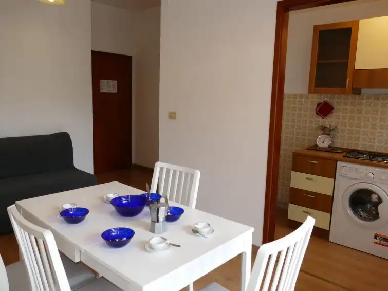Cosy apartment block, 3 storeys. 1 km from the centre of Diano Marina, 2 km from the centre of San Bartolomeo al Mare, 3 km from the centre of Cervo, 300 m from the sea. For shared use: tennis, public parking 100 m on the road. Grocery 700 m, supermarket 900 m, restaurant, bar 500 m, bakery 900 m, bus stop 100 m, railway station "Diano Castello" 1.5 km, sandy beach 300 m."Magnolia", 2-room apartment 60 m2 on 1st floor. Practical furnishings: living/dining room with 1 double sofabed (140 cm, length 200 cm). Exit to the balcony. 1 double bedroom. Exit to the balcony. Kitchenette (4 gas rings, toaster, kettle, microwave). Shower/bidet/WC. Gas heating. Heating available only from 01.11. to 08.04. Balcony 6 m2. View of the resort. Facilities: washing machine, hair dryer. Internet (WiFi, free). IT008027C23WIENUB6