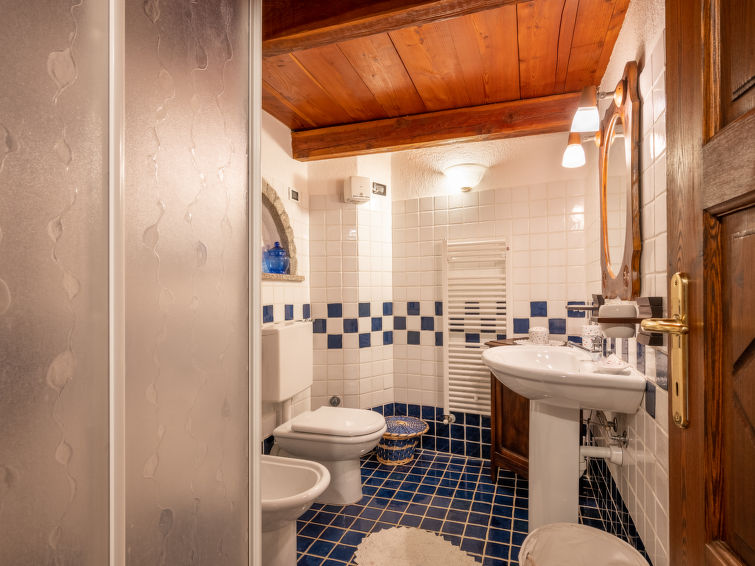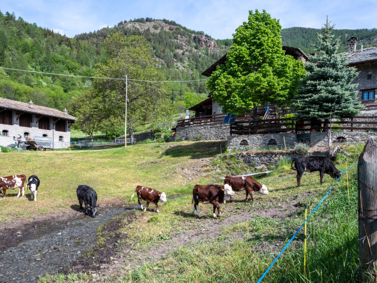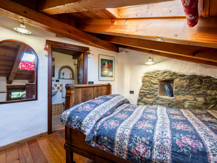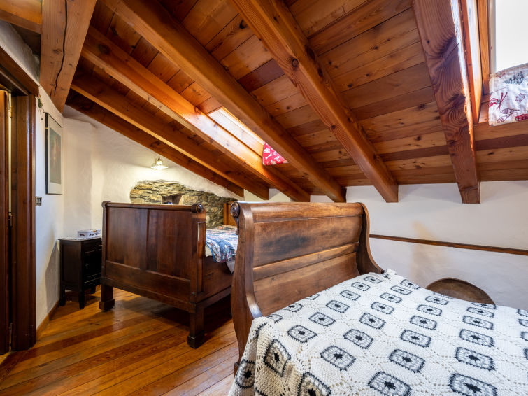 Rustic, historical terraced house "Maison Meynet", 1'200 m a.s.l., 3 storeys, semi-detached. In the hamlet Ville sur Sarre 8 km from the centre of Sarre, in a quiet position, south-east facing position. Private: garden (fenced) with lawn. Garden furniture, barbecue. In the house: storage room for bicycles, storage room for skis. In Winter: please take snow chains. Parking, public parking on the road. Supermarket 8 km, restaurant 8 km, bar 8 km, bus stop "Sarre" 8 km, thermal baths "Pre'-Saint-Didier" 36 km. Nearby attractions: Courmayeur Mont Blanc 36 km, Ovovia Aosta-Pila 12 km, pista di fondo Saint Nicholas 13 km. Please note: car recommended.4-room house 90 m2 on 4 levels. Partly with sloping ceilings, comfortable and wooden furniture furnishings: living/dining room with dining table and TV. Exit to the garden. Kitchenette (oven, dishwasher, 4 gas rings, electric coffee machine). Gas heating. Heating available only from 01.10. to 01.05. On the lower ground floor: small living room with open-hearth fireplace (only for decoration). Upper floor: 1 double bedroom. Exit to the balcony. Shower/bidet/WC. 2nd upper floor: 1 room with 1 bed and 1 french bed (140 cm), shower/WC. Parquet floors. Garden. Terrace furniture, barbecue, deck chairs. Panoramic view of the mountains and the valley. Facilities: washing machine, iron, children's high chair, baby cot for up to 3 year olds (extra), hair dryer. Internet (WiFi, free). Please note: non-smokers only. Private entrance. IT007066C2N75YBUAJ