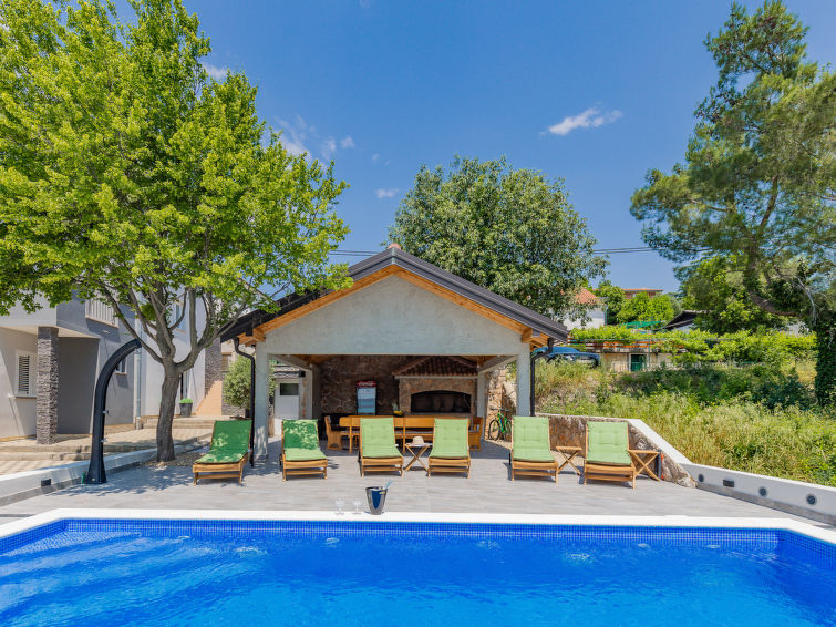Apartment house "Maja". 17 km from the centre of Starigrad, 300 m from the centre of Maslenica, 6 km from the centre of Posedarje, 40 m from the sea, 40 m from the beach. For shared use: property 310 m2, swimming pool angular (28 m2, depth 150 cm, seasonal availability: 01.May. - 15.Oct.) with salt water and internal staircase. Outdoor shower, arbour, barbecue, pool maintenance by the owner/gardener. In the house: internet access. Parking on the premises. Shop 40 m, bus stop 1.3 km, rocky beach 40 m. Please note: the owner lives in the same residence."Maja", 2-room apartment 40 m2 on 1st floor. Living/dining room with 1 double sofabed (155 cm, length 190 cm), satellite TV and air conditioning. Exit to the balcony. 1 room with 1 double bed (160 cm, length 200 cm). Open kitchen (4 hot plates, oven, toaster, kettle, microwave, freezer, electric coffee machine). Shower/WC. Electric heating. Balcony 6 m2. Balcony furniture. View of the sea. Facilities: washing machine. Internet (WiFi, free). Please note: non-smoking house. Private entrance.
