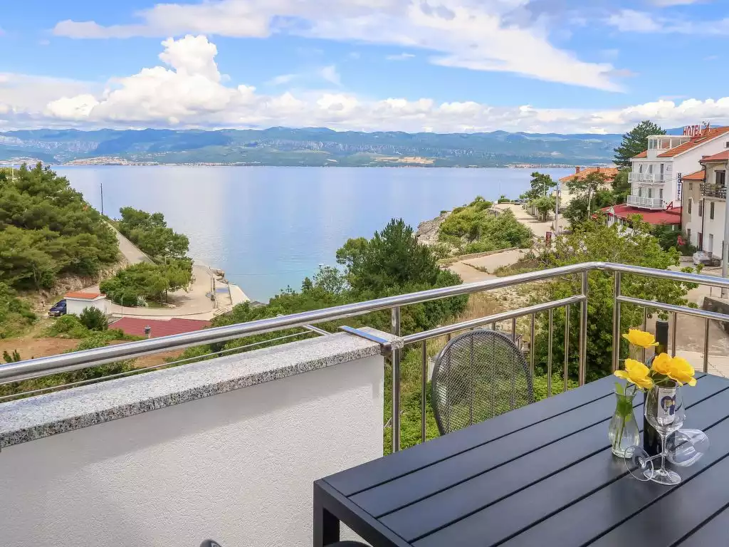 Apartment house "Marija". 300 m from the centre of Vrbnik, 12 km from the centre of Krk, 18 km from the centre of Malinska, in a sunny position, 200 m from the sea, 200 m from the beach, located by a road. For shared use: property 1'000 m2. In the house: internet access, washing machine (for shared use). Parking at the house. Shop 100 m, restaurant 250 m, bus stop 500 m, pebble beach 200 m. Please note: airfield 30 km from the property."Marija", 3-room apartment 70 m2 on 2nd floor. Bright: living/sleeping room with sloping ceilings with dining table, satellite TV and air conditioning. Exit to the balcony. With sloping ceilings, 1 room with 1 french bed (160 cm, length 200 cm), shower/WC and air conditioning. 1 room with 1 french bed (160 cm, length 200 cm). Kitchenette (oven, dishwasher, 4 ceramic glass hob hotplates, toaster, kettle, microwave, freezer, electric coffee machine). Shower/WC. Forced-air heating. Balcony. Balcony furniture. Very beautiful panoramic view of the sea and the mountains. Facilities: Internet (WiFi, free). Parking (2 cars). Please note: non-smokers only. Max. occupancy: 4 adults, 1 child up to 12 years old.