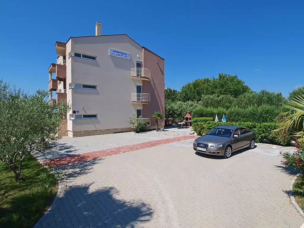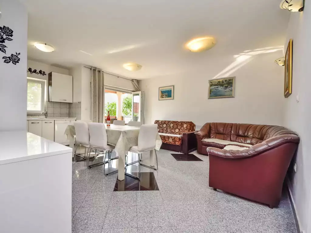 Bibinje 10 km from Zadar: Apartment house "Marko". 2 km from the centre of Bibinje, in a sunny position, 70 m from the sea, 70 m from the beach. For shared use: property 700 m2 (fenced), well-kept garden with lawn and trees, swimming pool angular heated (7 x 3 m, 24 m2, depth 150 cm, seasonal availability: 15.May. - 19.Oct.) with internal staircase. Outdoor shower, poolhouse with fridge, WC and cooking stove, terrace (32 m2), garden furniture, barbecue, children's playground (swing). In the house: internet access. Parking at the house on the premises. Shop, restaurant 650 m, café 100 m, bus stop 2.9 km, pebble beach 70 m, diving center 100 m, public bathing area 70 m. Marina 50 m, children's playground 100 m. Please note: private mooring (extra) on request. For shared use:terrace (20 m2). Possibility of renting house owner's car and trips by owner's boat (on request, extra).3-room apartment 65 m2, on the ground floor, south facing position. Living/dining room 30 m2 with 1 double sofabed (140 cm, length 200 cm), satellite TV (flat screen), air conditioning. Exit to the terrace. 1 room with 1 french bed (160 cm, length 200 cm), shower/WC and TV (flat screen). 1 room with 2 beds (90 cm, length 200 cm), TV (flat screen). Open kitchen (oven, dishwasher, 4 ceramic glass hob hotplates, microwave, freezer, electric coffee machine). Shower/bidet/WC. Forced-air heating. No heating option. Terrace 7 m2, roofed. Terrace furniture. Partial view of the sea. Facilities: safe. Internet (WiFi, free).
