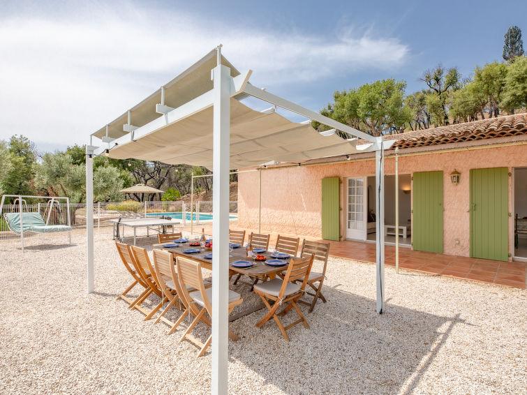Beautiful house "Mas des Chênes", surrounded by vineyards. 5 km from the centre of Grimaud, 15 km from the centre of Saint Tropez, 7 km from the centre of Cogolin, in a secluded position on a slope, 10 km from the sea. Private: property 3'000 m2 with trees, swimming pool fenced (11 x 5 m, seasonal availability: 01.Jan. - 31.Dec.). Table tennis, boules, pool maintenance by the owner/gardener. Parking on the premises. Shop 5 km, bus stop 4 km, sandy beach 10 km."Mas des Chênes", 6-room house 170 m2. Bright, beautiful furnishings: living/dining room with dining table and satellite TV. Exit to the terrace. 1 room with 2 beds and shower/WC. 2 rooms, each room with 1 french bed and shower/WC. Exit to the terrace. 1 room with 1 french bed and shower/WC. 1 room with 2 beds. Exit to the terrace. Open kitchen (1 hot plate, oven, dishwasher, 3 gas rings, toaster, microwave, freezer, electric coffee machine). Shower/WC. Electric heating. Terrace, patio. Terrace furniture, barbecue (portable), deck chairs. Panoramic view. Facilities: washing machine, children's high chair, baby cot. Internet (WiFi, free). Maximum 2 pets/ dogs allowed. When there are less than the maximum number of guests staying at the property, not all of the bedrooms will be available for use. 83068000486CN