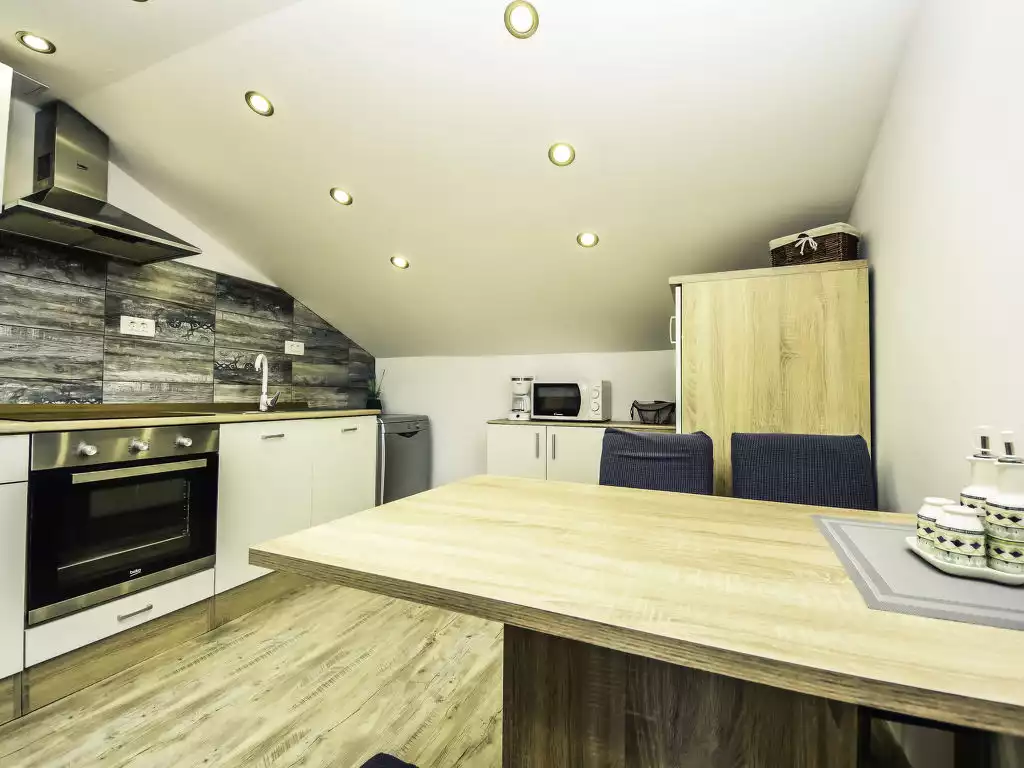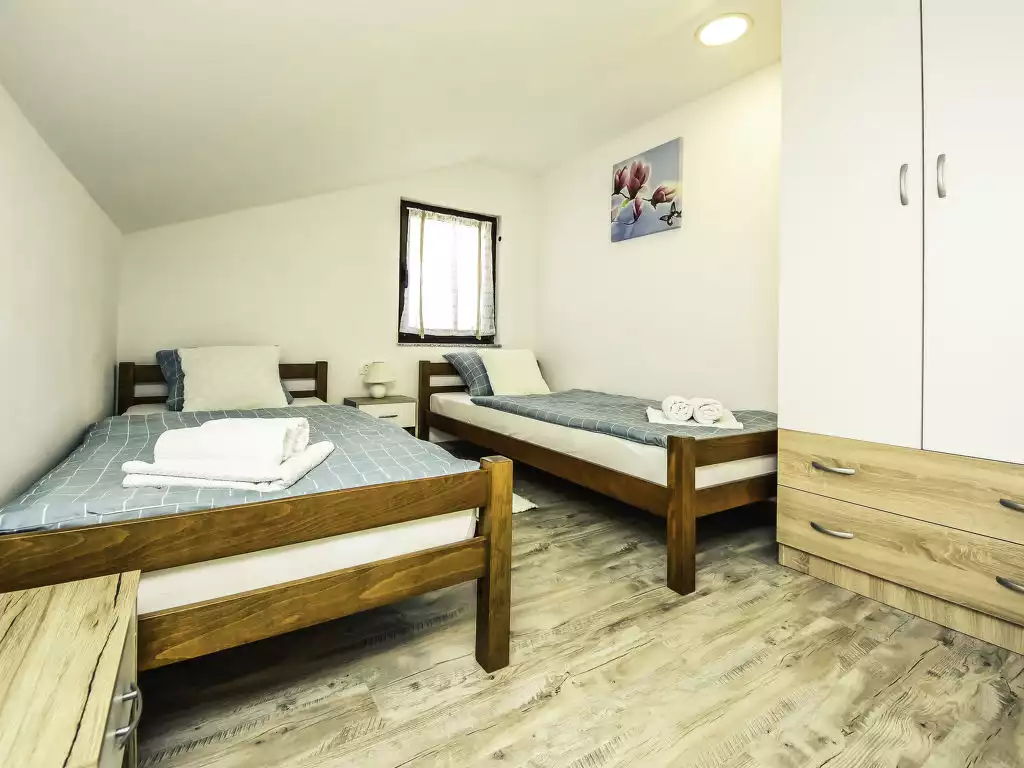 Apartment house "Matanovi Dvori". 1.5 km from the centre of Vir, in a sunny position, 300 m from the sea, 300 m from the beach. For shared use: property 250 m2 (fenced). In the house: internet access. Parking at the house on the premises. Shop, restaurant 400 m, bus stop 1.3 km, pebble beach, shingle beach 300 m. Please note: airfield 40 km from the property.3-room apartment 60 m2, on the top floor, north-east facing position. Living/dining room 36 m2, with sloping ceilings, ceiling height 130 - 270 cm with 1 sofabed (140 cm, length 200 cm), satellite TV (flat screen), air conditioning. Exit to the terrace. 1 room with sloping ceilings, ceiling height 130 - 270 cm with 1 french bed (160 cm, length 200 cm). 1 room with sloping ceilings, ceiling height 130 - 270 cm with 2 beds (90 cm, length 200 cm). Open kitchen (oven, dishwasher, 4 ceramic glass hob hotplates, microwave, freezer, electric coffee machine). Shower/WC. No heating option. Terrace 15 m2, roofed. Terrace furniture. Distant view of the sea. Facilities: Internet (WiFi, free).