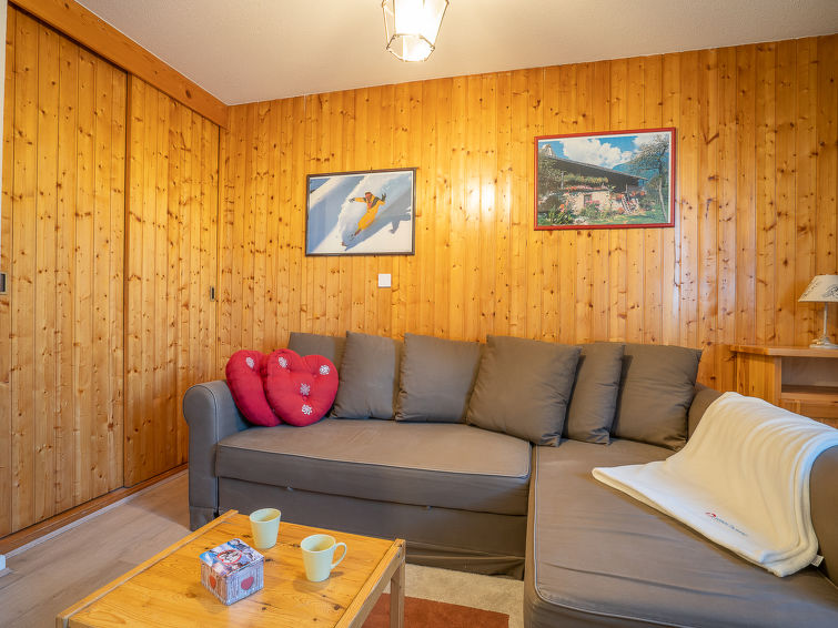 Residence "Les Mélèzes", 5 storeys. In the district of Reberty 1850, in a quiet position, 30 m from the skiing area. In the complex: lift, storage room for skis. Public parking. Grocery, supermarket, restaurant 20 m, bus stop "Reberty 1850" 300 m. Sports centre 1 km, skisport facilities 60 m, slopes 30 m. Well-known ski regions can easily be reached: 3 Vallées. Please note: the photograph shows a typical example. Additional accommodations can be booked."Mélèzes 66", 2-room apartment 35 m2, on the ground floor. Beautiful furnishings: living/dining room with TV (flat screen). 1 room with sliding door with 1 double sofabed (150 cm, length 200 cm). Entrance hall with 1 x 2 bunk beds (80 cm, length 190 cm), 1 sleeping facility (80 cm, length 190 cm). Kitchenette (4 hot plates, dishwasher, kettle, microwave, electric coffee machine, raclette grill). Shower, sep. WC. Electric heating. Balcony, west facing position. View of the mountains. Facilities: Internet (WiFi, extra). Please note: smoke alarm. 73257007461MX