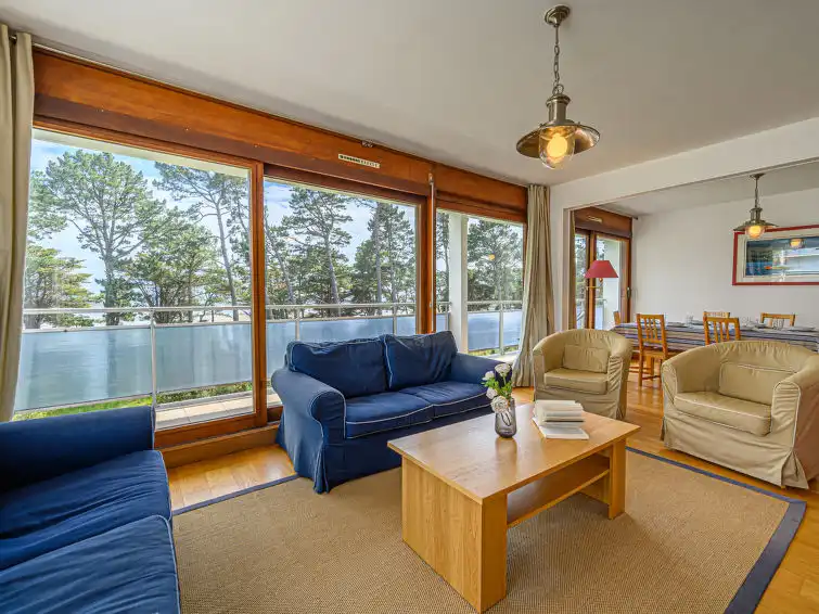 St Philibert 7 km from Carnac: Residence "Men Er Bellec", 5 storeys, surrounded by trees. From the sea, 50 m from the beach. In the complex: lift. Parking. Shop 2 km, restaurant 500 m, bar 2 km, bakery 2 km, sandy beach "Men Er Beleg" 50 m, thermal baths "Thalassothérapie de Carnac" 8 km. Marina 5 km, golf course (18 hole) 20 km, sailing school 2 km. Nearby attractions: La Trinité sur Mer 4 km, Locmariaquer - Golf du Morbihan 4 km, Alignements de Carnac 8 km, Auray 14 km, Presqu'Ile de Quiberon belle ile en Mer 21 km, Vannes 30 km. Please note: suitable for families. Groups of teenagers on request only. The keys‘ handover takes place by the agency Interhome in Carnac, 7 km.4-room apartment 90 m2 on 4th floor. Comfortable furnishings: living/dining room with TV (flat screen). Exit to the terrace. 1 room with 1 french bed (1 x 160 cm, length 200 cm). Exit to the terrace. 2 rooms, each room with 2 beds (90 cm, length 190 cm). Kitchen (oven, dishwasher, 4 ceramic glass hob hotplates, toaster, kettle, microwave, electric coffee machine). Bathroom, shower, sep. WC. Electric heating. Large terrace 50 m2, east facing position and south facing position. Terrace furniture, deck chairs (4). View of the sea. Facilities: washing machine, dryer. Internet (WiFi, free). Garage (1 car). Please note: smoke alarm. Offer by a private individual according to Art. 155, IV of CGI.