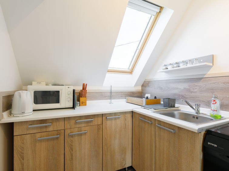 Balatonkeresztùr 20 km from Keszthely: Modern 2-family house "Meretei Porta", detached, renovated in 2022. 1.5 km from the centre of Balatonkeresztur, in a quiet, sunny position, 2 km from the lake, 2 km from the beach. For shared use: garden 500 m2 (fenced), meadow. Garden furniture. In the house: air conditioning, washing machine. Parking (for 2 cars) on the premises. Shop 700 m, restaurant 800 m, grass beach 1.5 km, thermal baths "Hévíz" 25 km, lake Lake Balaton 1.5 km. Tennis 8 km, riding stable 28 km, children's playground 1 km. Nearby attractions: Festetics Castle 20 km, Bobo Fun Park 25 km, Adventure Park Zamárdi 63 km, Festetics Zoo, game farm 26 km, Kereki Dinosaur Park 54 km, Kis-Balaton Visitor Centre 13 km. Please note: Loading and unloading of baggage is possible at the holiday house.4-room apartment 55 m2, on the upper floor. Object suitable for 4 adults. Bright, renovated in 2022, very modern and stylish furnishings: entrance hall. Open living/dining room with satellite TV and flat screen. Exit to the balcony. 2 double bedrooms, each room with 2 beds. Small kitchen (2 hot plates, toaster, kettle, microwave, electric coffee machine) with dining table. Bath/shower/WC. Heating, air-conditioning. Large balcony. Balcony furniture, barbecue. Very beautiful view of the garden and the countryside. Facilities: Internet (WiFi, free). The owner lives in the same house on the ground floor, with a separate entrance. MA22050166