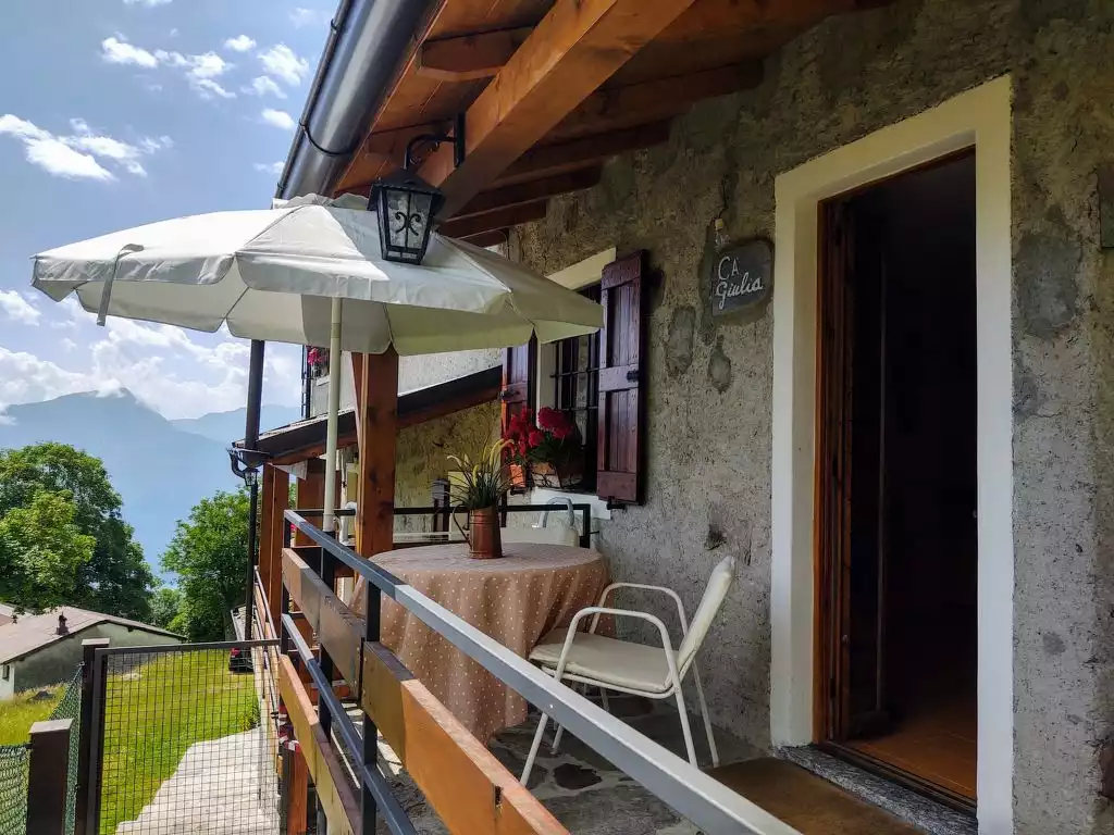 Rustic 3-family house "Mia e Giulia", 1'115 m a.s.l.. Above Peglio, in the hamlet Bodone 12 km from the centre of Gravedona, 60 km from the centre of Como, 64 km from the centre of Lecco, in an elevated position on a slope, 12 km from the lake, in the countryside. For shared use: property (fenced) with meadow. 5 km long narrow motor access (mountain road). Stepped path to the house. Parking at the house. Shop 5 km, supermarket 13 km, bus stop 5 km, railway station "Como" 60 km, pebble beach "Lido di Gravedona" 12 km, outdoor swimming pool 12 km. Marina 12 km, golf course (18 hole) 39 km. Nearby attractions: Chiesa Santa Maria del Tiglio Gravedona, Agriturismo Zertin, Palazzo Gallio-Gravedona, Parco Valle Albano, Lake Como Adventure Park, Gravedona. Well-known lakes can easily be reached: Lago di Mezzola, Lago di Lugano. Hiking paths: Monte la Motta, Monte Duria, Alpe Paregna.5-room apartment 70 m2 on 2 levels, south facing position. Partly with sloping ceilings, rustic and wooden furniture furnishings: kitchen-/living room (oven, 4 gas rings, toaster, electric coffee machine) with small dining table, open-hearth fireplace and satellite TV. Exit to the garden. Shower/WC. Upper floor: (spiral staircase), 1 room with 1 french bed (180 cm), dining table. Top floor: (exterior staircase) living/dining room with dining table, satellite TV and wood-burning stove. Exit to the balcony. 1 room with 1 french bed (160 cm). 1 small room with 1 bed and 1 pull-out bed. Open kitchen (oven, 4 gas rings, toaster, microwave, freezer, electric coffee machine). Shower/WC. Gas heating. Balcony, east facing position, 2 balconies, west facing position and south facing position, patio, garden, lawn. Balcony furniture, deck chairs (4). Marvellous panoramic view of the lake. Facilities: children's high chair, baby cot for up to 2 year olds. Internet (WiFi, free). Please note: maximum 3 pets/ dogs allowed. Private entrance. No internal connecting door between the separated properties. IT013178C28SPLGBPT