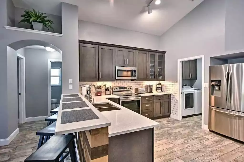 The fully equipped kitchen is a home chef’s dream, complete with stainless steel appliances, quartz countertops, and all the essentials to whip up a family feast. Start your morning with coffee from the Keurig or prepare a slow-cooked dinner with the provided gadgets and tools. Gather around the breakfast bar or dining table to share meals and laughter.