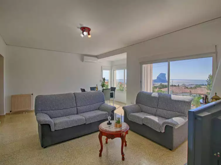Villa "Mimosa". 2 km from the centre of Calpe, in a quiet, sunny position residential area (villas), traffic calmed area, 2.5 km from the sea, 2.5 km from the beach. Private: swimming pool (7 x 4 m, seasonal availability: 01.Jan. - 31.Dec.). Outdoor shower. Bus stop 450 m."Mimosa", 3-room villa 123 m2. Spacious and bright, practical and comfortable furnishings: living/dining room with digital TV, air conditioning and forced-air heating. 1 room with 1 french bed, air conditioning and forced-air heating. 1 room with 1 french bed. Kitchen (oven, 4 gas rings, toaster, kettle, microwave, electric coffee machine). Shower/WC. Large terrace. Distant view of the sea, the resort and the town. Facilities: washing machine, iron, hair dryer. Internet (WiFi, free). Parking. AT-504878-A // Reg. Nr.: ESFCTU00000302900026316800000000000000000AT-504878-A2