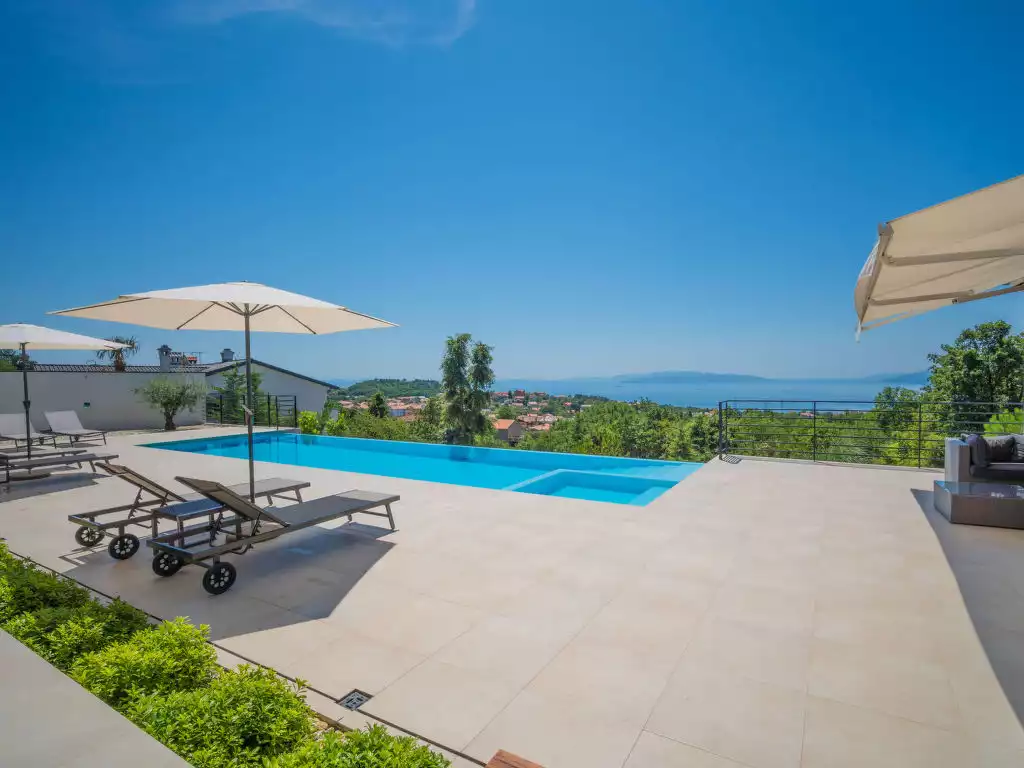 Matulji: Modern villa "Minimal", 2 storeys, built in 2018. In the hamlet Spinčići 1.5 km from the centre of Matulji, 6 km from the centre of Opatija, in a quiet, sunny, elevated position, 4 km from the sea, 4 km from the beach, in a cul-de-sac, in the countryside. Private: property 1'300 m2 (fenced), swimming pool angular, heated (10 x 4 m, depth 150 cm, seasonal availability: 01.Apr. - 30.Oct.) with internal staircase. Outdoor shower, table tennis, basketball, terrace (130 m2), barbecue. In the house: internet access, sauna, hot tub, billiard table, air conditioning, washing machine. Parking (for 3 cars) at the house on the premises. Shop 350 m, restaurant 1 km, bus stop 350 m, pebble beach 4 km, concrete beach 4 km. Groups of teenagers on request only. Neighbourhood highly sensitive to noise. Quietness and good behaviour expected. Swimming pool with hydromassage. Swimming pool heated (extra). Organizing a party is not allowed.5-room villa 300 m2 on 2 levels, south facing position. Beautiful and modern furnishings: large living/dining room 120 m2 with panoramic window with satellite TV (flat screen). Exit to the terrace, to the swimming pool. Open kitchen (oven, dishwasher, 4 ceramic glass hob hotplates, microwave, freezer, electric coffee machine). Shower, sep. WC. Upper floor: 2 rooms with panoramic window, each room with 1 french bed (180 cm, length 200 cm), shower/WC and satellite TV (flat screen). Exit to the terrace. 1 room with panoramic window with 2 beds (90 cm, length 200 cm), shower/WC and satellite TV (flat screen). Exit to the terrace. 1 room with panoramic window with 1 french bed (180 cm, length 200 cm), bath/WC, double hand-basin and satellite TV (flat screen). Exit to the terrace. Floor heating. Terrace 110 m2, terrace 65 m2 partly roofed. Terrace furniture, barbecue (portable), deck chairs, box-room. Beautiful view of the sea and the swimming pool. Facilities: safe, hair dryer. Internet (WiFi, free). Garage (2 cars).