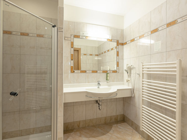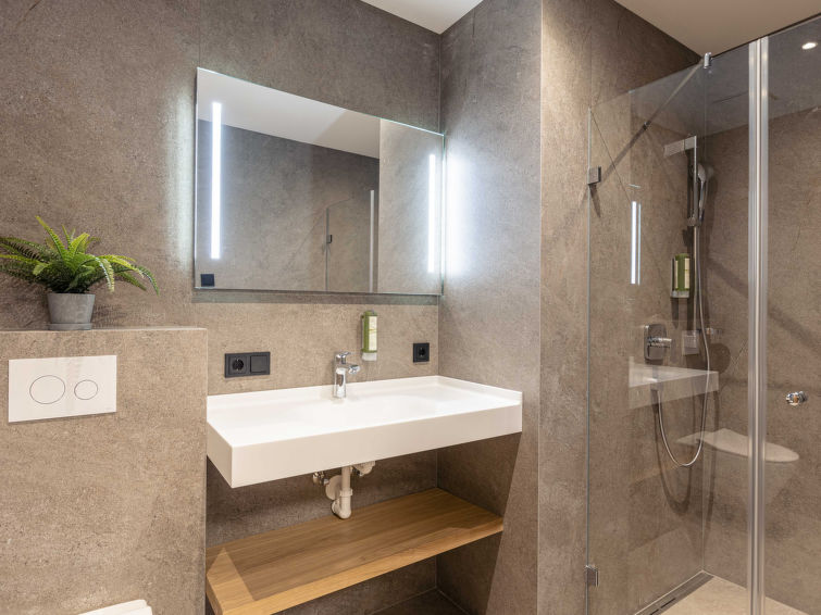 Reith bei Kitzbühel: Modern resort "Dorfresort Kitzbühel by AlpsResorts", 2 storeys. In the centre of Reith 6 km from the centre of Kitzbühel, 4 km from the lake, 5 km from the skiing area. For shared use: nat. Swimm. Pond. In the complex: sauna, steam room, hot tub, infrared sauna, relaxation room, spa area, storage room for bicycles, storage room for skis, central heating system. Parking at the house. Supermarket 500 m, restaurant 5 m, railway station "Kitzbühel Schwarzsee" 4 km. Skisport facilities 5 km, children's ski school 5 km. Well-known ski regions can easily be reached: KitzSki Hahnenkammbahn 6 km, Übungslift Reith 150 m. Well-known lakes can easily be reached: Schwarzsee 4 km. Please note: ski bus (free of charge). The holiday properties may differ in situation, size and location. Directly connected to the resort: Restaurant Reitherwirt!"mit 2 Schlafzimmern für 6 Personen", 3-room apartment 61 m2. Bright, tasteful furnishings: living/sleeping room with 1 sofabed, dining table and satellite TV (flat screen). 1 room with 1 sofabed and 1 double bed. 1 double bedroom. Open kitchen (oven, dishwasher, 4 ceramic glass hob hotplates, toaster, kettle, electric coffee machine). 2 showers/WC. Balcony. Balcony furniture. Beautiful view of the mountains. Facilities: hair dryer. Internet (WiFi, free). Please note: non-smokers only. The property is one of a type of property or apartment.