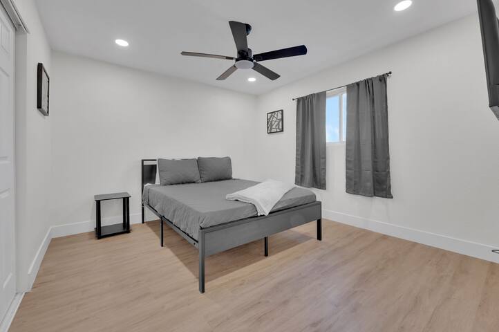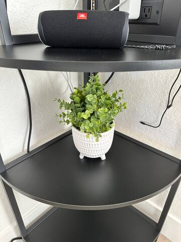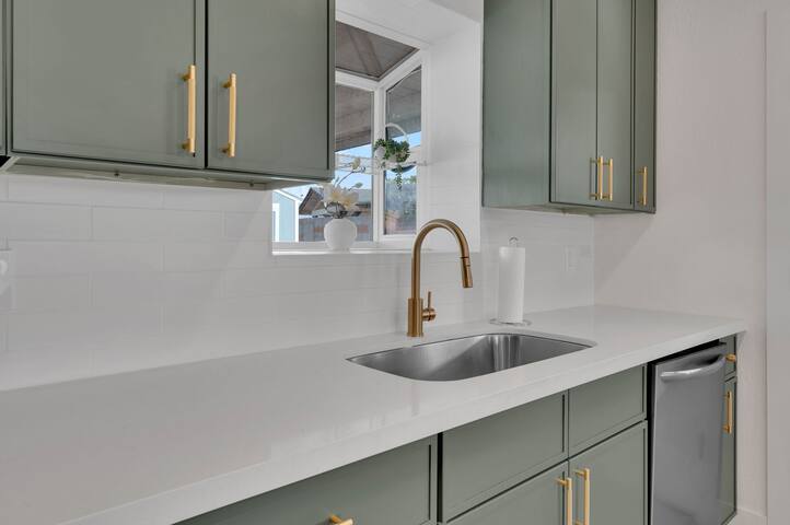 4 Bedrooms, 2.5 bathrooms. The Master bedroom is the entire bottom level in which there are two walk in closets, one with laundry and drying rack, smart TV and a master bath with a XL shower and two sinks. The other 3 bedrooms are upstairs along with another full bath which has tub/shower. The 3 bedrooms consist of one queen bed, one full and two twin beds. The Queen bedroom has a smart TV as well. All bedrooms have spacious closets and extra linens. There are plenty of bath and pool towels for guests. The main level is an open concept living room and kitchen. It has a full kitchen with gas stove, dishwasher, fridge with water/ice dispenser, garbage disposal and all your essential cooking utensils. Also, included is a coffee maker, blender, and hot water kettle. The living room area has a smart TV, couches and a JBL speaker for guest use. The corner shelf has LED lights so set the mood at night with your choice of lighting. The outdoor area has a pool, firepit, grill and outdoor furniture including a hammock. Pool floats and toys located in shed. The seats on the turf grass also have storage if you lift up the seat. And if you're feeling cute, take some pictures in front of the green wall decorated with flowers and neon butterflies! It makes for some nice aesthetics!