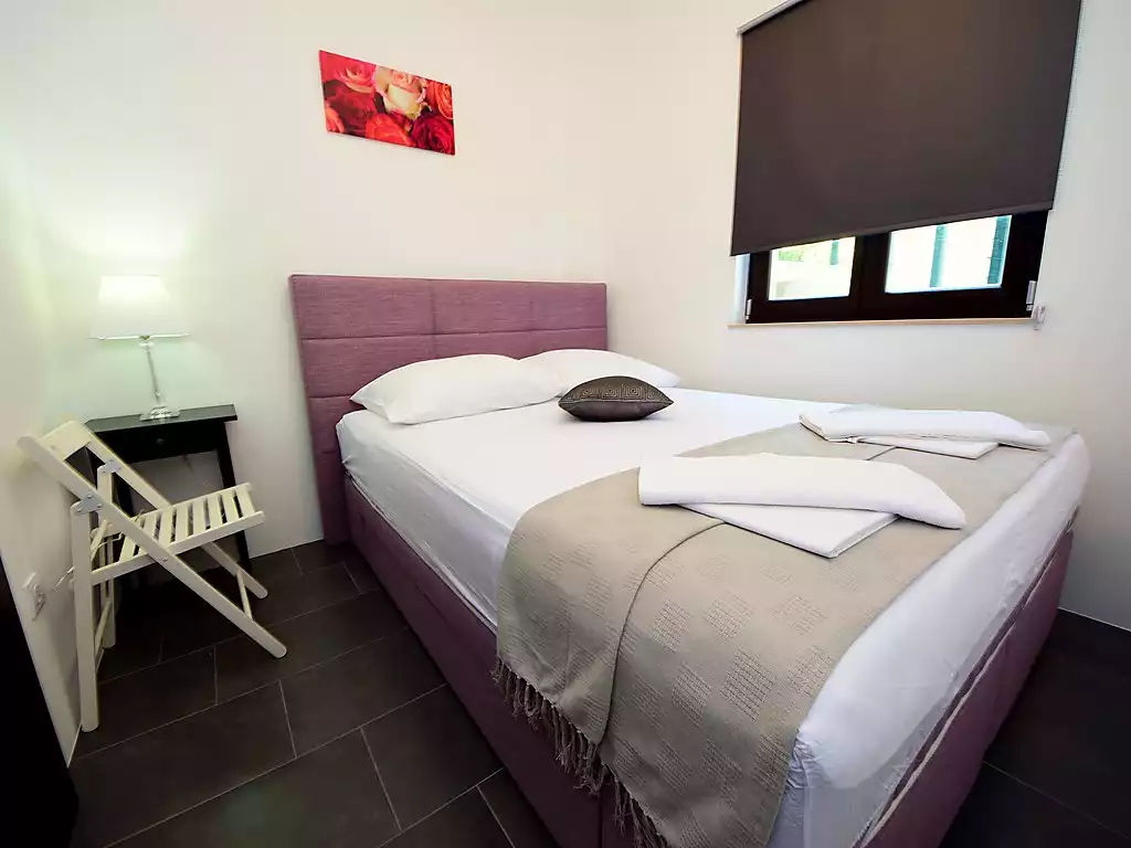 Apartment house "Molo Lozna". 900 m from the centre of Postira, in a sunny, elevated position, 260 m from the sea, 260 m from the beach, in a cul-de-sac. For shared use: property 400 m2. In the house: internet access. Parking at the house on the premises. Shop 420 m, restaurant 250 m, bus stop 1.8 km, pebble beach 260 m.3-room apartment 70 m2 on 1st floor, east facing position. Living/dining room with 1 double sofabed (140 cm, length 200 cm), satellite TV (flat screen), air conditioning. Exit to the balcony. Entrance hall with air conditioning. 1 room with 1 french bed (160 cm, length 200 cm). Exit to the terrace. 1 room with 1 french bed (160 cm, length 200 cm). Open kitchen (oven, 4 ceramic glass hob hotplates, freezer, electric coffee machine). 2 showers/WC. Forced-air heating. Balcony 8 m2, terrace 10 m2. Terrace furniture, barbecue. View of the sea. Facilities: washing machine. Internet (WiFi, free). Please note: non-smoking house.