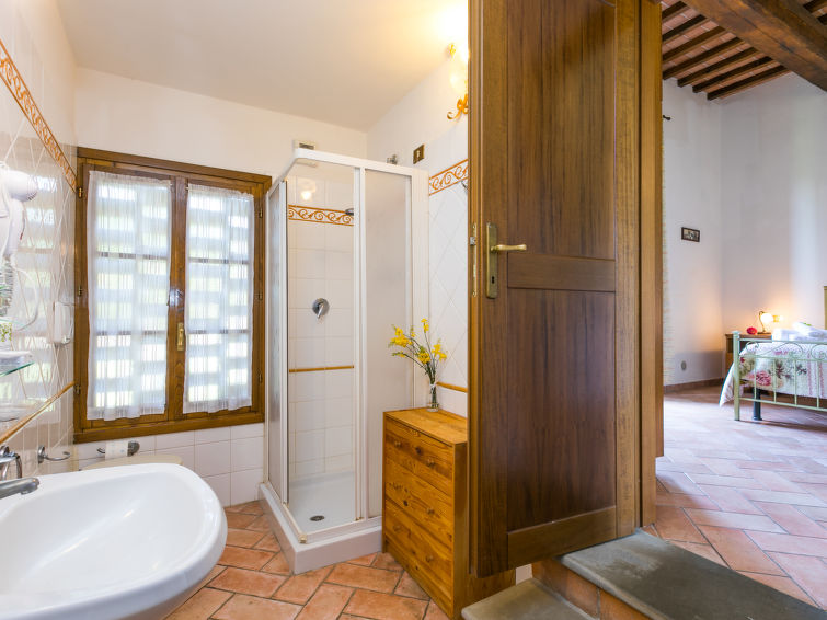 Large working farm "Montereggi", built in 1600. 12 apartments in the property. 12 km from the centre of Vinci, 33 km from the centre of Firenze, 45 km from the centre of San Gimignano, in a secluded, quiet, sunny position on top of a hill, in the countryside. For shared use: property 100 ha, swimming pool fenced (18 x 8 m, depth 100 - 150 cm, seasonal availability: 04.May. - 28.Sep.). Outdoor shower, garden furniture, barbecue. In the complex: WiFi, washing machine. Motor access to the house (600 m via unmade road). Parking at the house. E-charging station. Grocery 1 km, supermarket 3 km, bus stop 300 m, railway station "Montelupo Fiorentino" 3 km, thermal baths "Montecatini Terme" 33 km. Golf course (9 hole) 9 km. Nearby attractions: Montelupo Fiorentino 5 km, Carmignano 10 km, San Miniato 17 km, San Casciano in Val di Pesa 22 km. Local sale of farm products. Please note: the photograph shows a typical example.2-room apartment 55 m2. Practical and tasteful furnishings: living/dining room with 1 double sofabed (140 cm), satellite TV and air conditioning. 1 double bedroom with air conditioning. Kitchenette (4 hot plates, oven). Shower/bidet/WC. IT048008B5DXDR5D6D