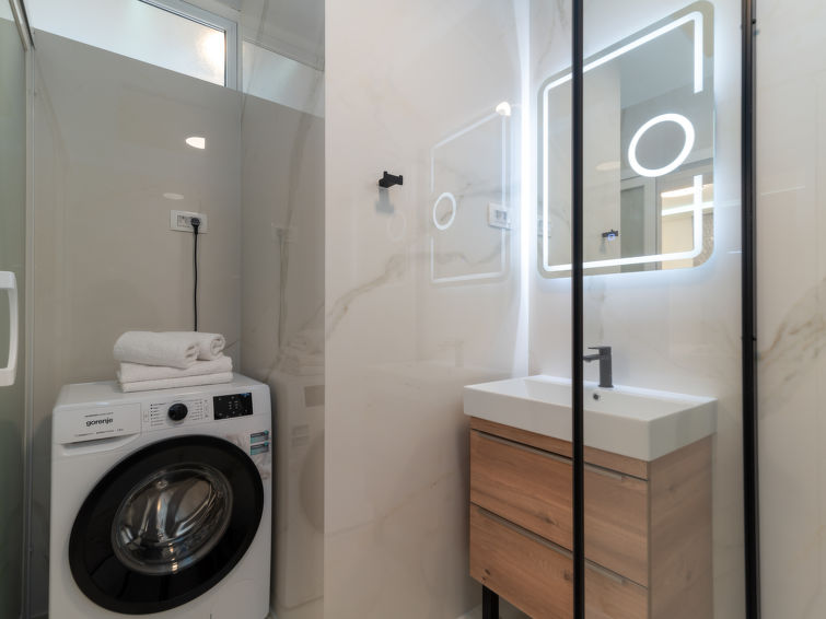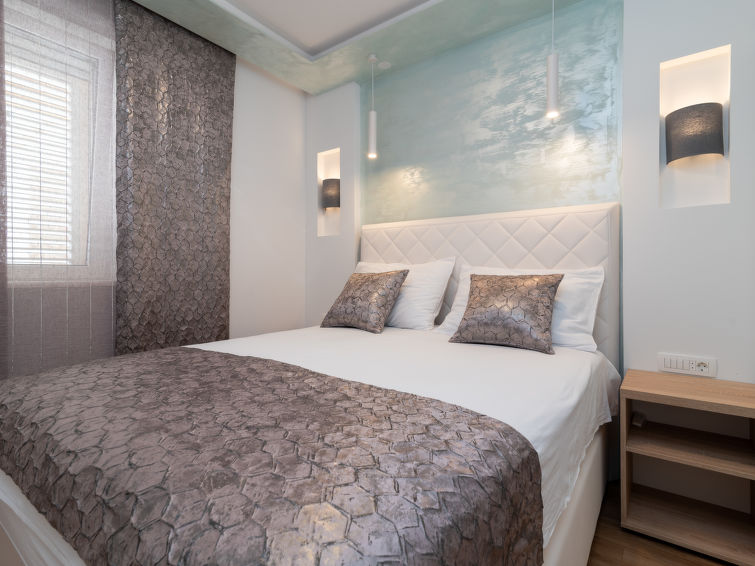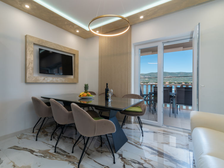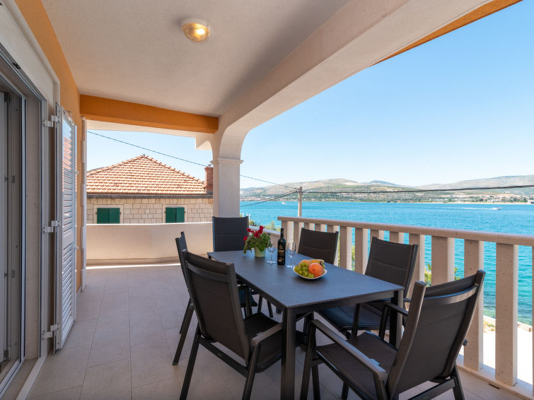 Arbanija (Čiovo) 4 km from Trogir: Apartment house "Mornar". 550 m from the centre of Arbanija, in a sunny position, 20 m from the sea, 20 m from the beach, road to cross, located by a road. For shared use: property 466 m2, swimming pool angular heated (7 x 3 m, 24 m2, depth 126 - 176 cm, seasonal availability: 01.Apr. - 15.Oct.) with internal staircase. Terrace (30 m2), barbecue. In the house: internet access. Available: boat (extra). Public parking on the road. Shop, restaurant 550 m, bus stop 100 m, pebble beach, rocky beach, concrete beach 20 m. Please note: private mooring (extra) on request. Motor boat of the house owner can be hired (on request, extra). Please note: licence required.4-room apartment 80 m2 on 1st floor, north-west facing position. Living/dining room with satellite TV (flat screen), air conditioning. Exit to the terrace. 2 rooms, each room with 1 french bed (160 cm, length 200 cm), shower/WC and satellite TV (flat screen), air conditioning. 1 room with 1 french bed (160 cm, length 200 cm), shower/WC and satellite TV (flat screen), air conditioning. Exit to the terrace. Open kitchen (oven, 4 ceramic glass hob hotplates, toaster, microwave, freezer, electric coffee machine). Air-conditioning, forced-air heating (extra). Terrace 43 m2 partly roofed. Terrace furniture. View of the sea. Facilities: washing machine. Internet (WiFi, free).