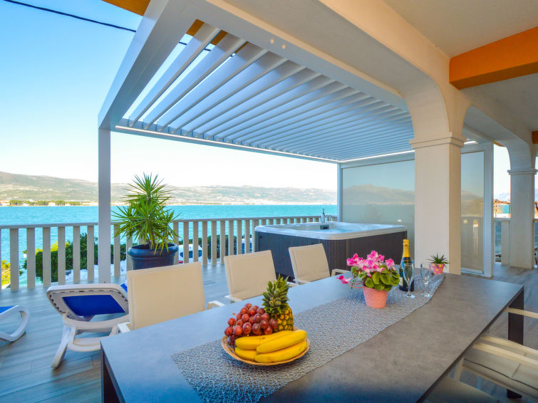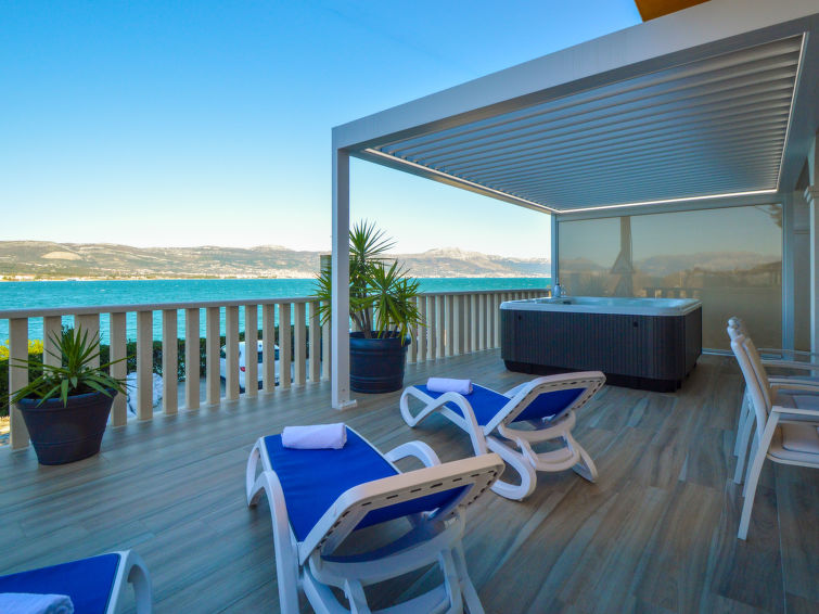 Arbanija (Čiovo) 4 km from Trogir: Apartment house "Mornar". 550 m from the centre of Arbanija, in a sunny position, 20 m from the sea, 20 m from the beach, road to cross, located by a road. For shared use: property 466 m2, swimming pool angular heated (7 x 3 m, 24 m2, depth 126 - 176 cm, seasonal availability: 01.Apr. - 15.Oct.) with internal staircase. Terrace (30 m2), barbecue. In the house: internet access. Available: boat (extra). Public parking on the road. Shop, restaurant 550 m, bus stop 100 m, pebble beach, rocky beach, concrete beach 20 m. Please note: private mooring (extra) on request. Motor boat of the house owner can be hired (on request, extra). Please note: licence required.4-room apartment 90 m2, on the upper ground floor, north-west facing position. Living/dining room 24 m2 with satellite TV (flat screen), air conditioning. 3 rooms, each room with 1 french bed (160 cm, length 200 cm), shower/WC and satellite TV (flat screen), air conditioning. Exit to the terrace. Open kitchen (oven, dishwasher, 4 ceramic glass hob hotplates, microwave, freezer, electric coffee machine). Hydro massage bath. Air-conditioning (extra). No heating option. Terrace 90 m2. Terrace furniture. View of the sea. Facilities: washing machine. Internet (WiFi, free). Private: hot tub on the terrace 90 m2.