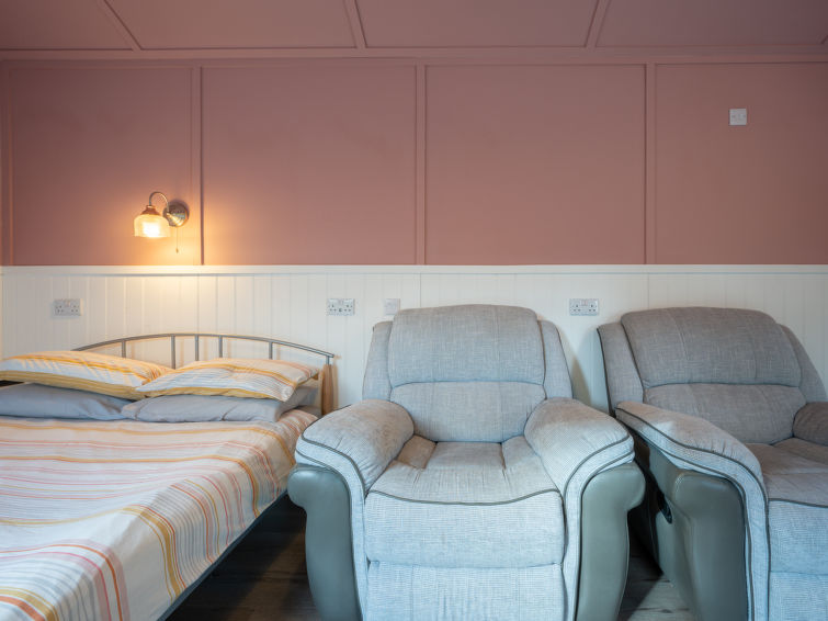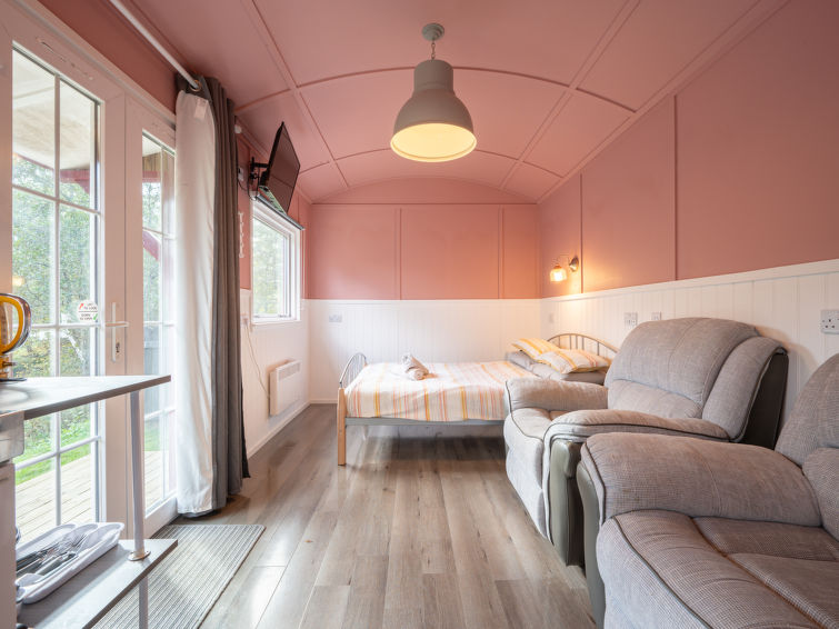 Bearnock, Loch Ness 10 km from Drumnadrochit: Modern, comfortable chalet "Munro", detached, built in 2023. 9 houses in the resort. In a quiet position, 5 m from the river. In the house: central heating system. Parking. Shop 10 km, grocery 10 km, supermarket 10 km, restaurant 3 km, bicycle rental 6 km, bus stop 400 m, railway station "Inverness" 35 km. Golf course (18 hole) 30 km, riding stable 10 km. Nearby attractions: Urquhart Castle 12 km, Glen Affric 17 km, Fort Augustus 40 km, Kyle Of Lochalsh - Isle of Skye 110 km. Well-known lakes can easily be reached: Loch Ness 12 km. Hiking paths: Great Glen Way. Please note: car recommended."Munro", 1-room chalet on the ground floor. Comfortable and modern furnishings: open living/dining room with 1 double bed, dining table, shower/WC and TV (flat screen). Exit to the veranda. Kitchenette (2 hot plates, kettle, microwave). Small patio. Terrace furniture. Beautiful view of the river. Parking. Please note: suitable for families. Fridge without freezer, non-smoking house. TV only EN. Smoke alarm.