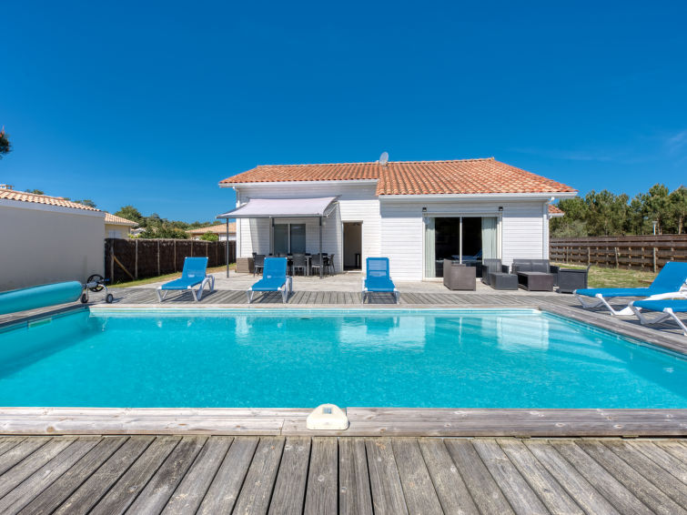 Villa "Nael". 1.5 km from the centre of Montalivet-les-Bains, 18 km from the centre of Soulac-sur-Mer, 21 km from the centre of Lesparre-Médoc, in the residential district, 800 m from the sea. Private: property 800 m2 (fenced), swimming pool heated (8 x 4 m, depth 150 cm, seasonal availability: 01.May. - 30.Sep.). Boules, parking at the house on the premises. Shop 1.5 km, bus stop "Av. De l'Europe/Montalivet" 1.5 km, sandy beach "Vensac-Océan" 800 m."Nael", 5-room house 130 m2. Modern and tasteful furnishings: living/dining room with dining table, satellite TV and international TV channels (flat screen), hi-fi system and DVD. Exit to the terrace. 1 room with 1 french bed (160 cm, length 200 cm), bath/shower. Exit to the terrace. 2 rooms, each room with 1 french bed (140 cm, length 190 cm). 1 room with 2 beds (90 cm, length 190 cm). Open kitchen (oven, dishwasher, 4 ceramic glass hob hotplates, toaster, kettle, microwave, freezer, electric coffee machine). Exit to the terrace. Bathroom, bath/shower, 2 sep. WC's. Electric heating. Large terrace. Terrace furniture, barbecue (portable), deck chairs (8). Facilities: washing machine, iron, children's high chair, baby cot for up to 2 year olds. Internet (WiFi, free). Please note: non-smoking house. Maximum 2 pets/ dogs allowed. Smoke alarm.