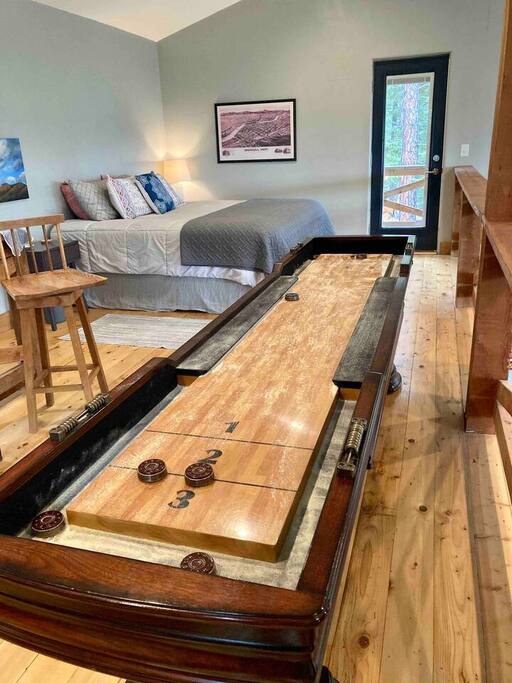 Nature House features two distinct sleeping areas depending on your mood and needs. Downstairs is a cozy, dark, romantic bedroom with queen size bed and television. Upstairs in the loft, wake up to trees and dazzling lake views in the cloud-like king size bed and enjoy a cup of coffee and good conversation in the comfortable sitting area. Along with wireless internet and 50" Smart televisions in the living room and downstairs bedroom, you’ll find a nice selection of books, music, magazines, and games for entertainment. And shuffleboard! There’s an 8’ shuffleboard table in the loft, for those guests with a bit of a competitive streak! A beautiful full kitchen looking over the lake, propane grill and outdoor seating on the spacious deck, and a stock of basic spices, oils, and condiments, make cooking at home delightful and easy. Love coffee? There's a grinder, French press, traditional drip pot, and coffee grounds all ready for that morning cup.
