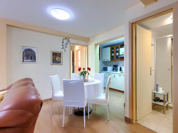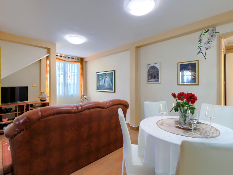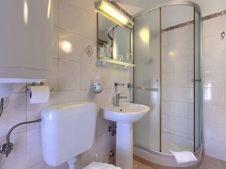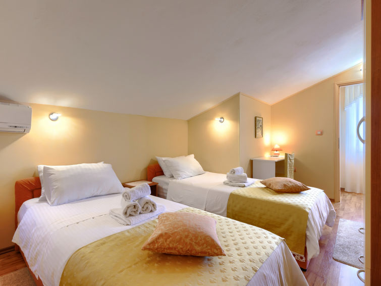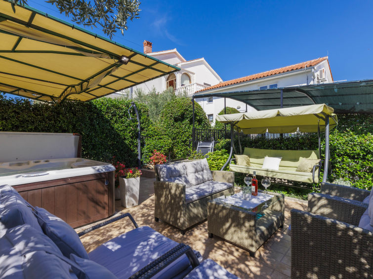 Beautiful single-family house "Nena". 500 m from the centre of Buje, in a quiet, sunny, elevated position, 10 km from the sea, 10 km from the beach, in a cul-de-sac. Private: garden 40 m2 (fenced) with wildlife garden and flowers, swimming pool (above ground) heated (2 x 2 m, depth 70 cm, seasonal availability: 01.Apr. - 30.Oct.). Outdoor shower, garden furniture, barbecue. In the house: internet access, washing machine. Parking at the house on the premises. Grocery 200 m, supermarket, restaurant, café 500 m, bus stop 1 km, pebble beach 10 km, public bathing area 10 km. Golf course (18 hole) 18 km, tennis 1 km, sports centre 10 km, walking paths from the house, cycle lane 500 m. Swimming pool for private use is a hot tub for 3 persons. Well-known bicycle route “Parenzana” 500 m from the house.4-room house 96 m2 on 2 levels. Beautiful furnishings: living/dining room with satellite TV (flat screen), air conditioning. 1 room with 1 bed (140 cm, length 200 cm), separate WC and air conditioning. Dining room. Exit to the terrace. Open kitchen (2 hot plates, mini-oven, dishwasher, microwave, freezer, electric coffee machine). Shower/WC. No heating option. Upper floor: 1 room with sloping ceilings, - 160 cm with 2 beds (90 cm, length 200 cm), shower/WC and air conditioning. 1 room with sloping ceilings, - 160 cm with 1 french bed (160 cm, length 200 cm), shower/WC and air conditioning. Terrace 32 m2. Terrace furniture, deck chairs (4). Facilities: washing machine, telephone, safe, iron, mosquito net, hair dryer. Internet (WiFi, free).